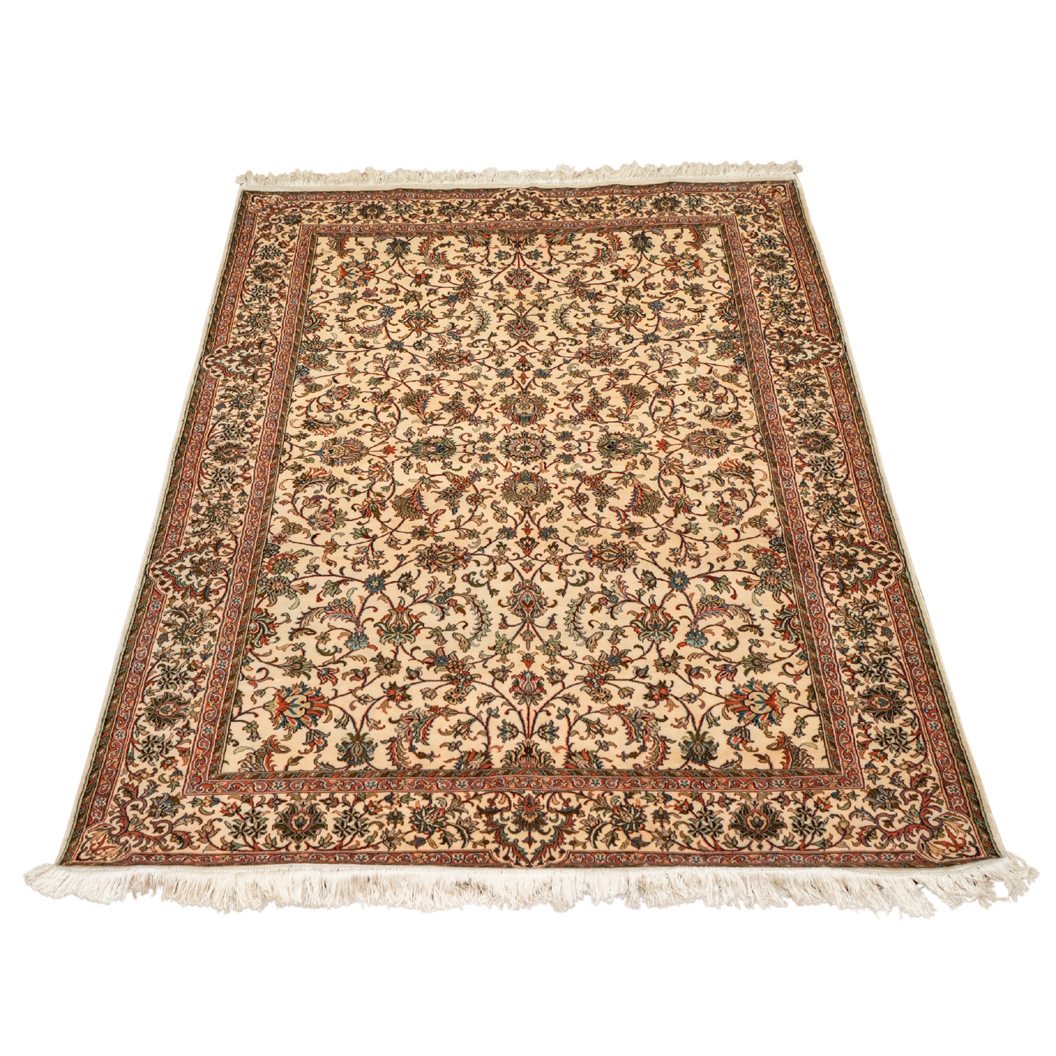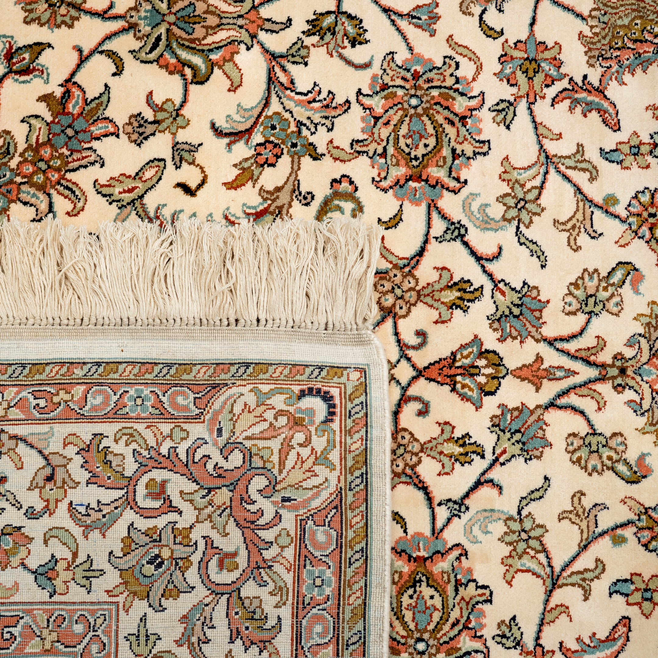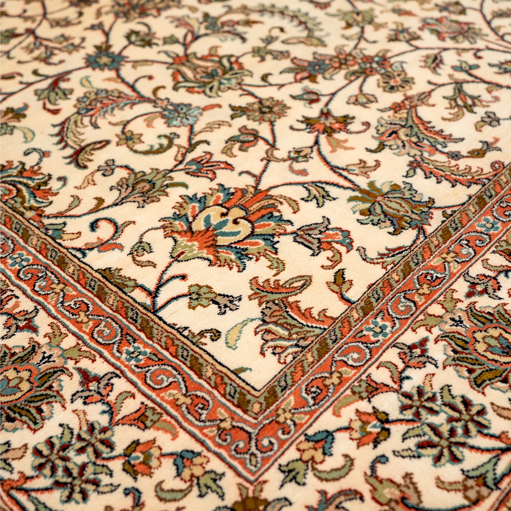This hand-knotted carpet presents a finely balanced all-over botanical composition, where delicate vines and floral motifs flow seamlessly across an ivory ground. The design is continuous and measured, creating a calm visual rhythm without a dominant central medallion. Its beauty lies in repetition, detail, and restraint.