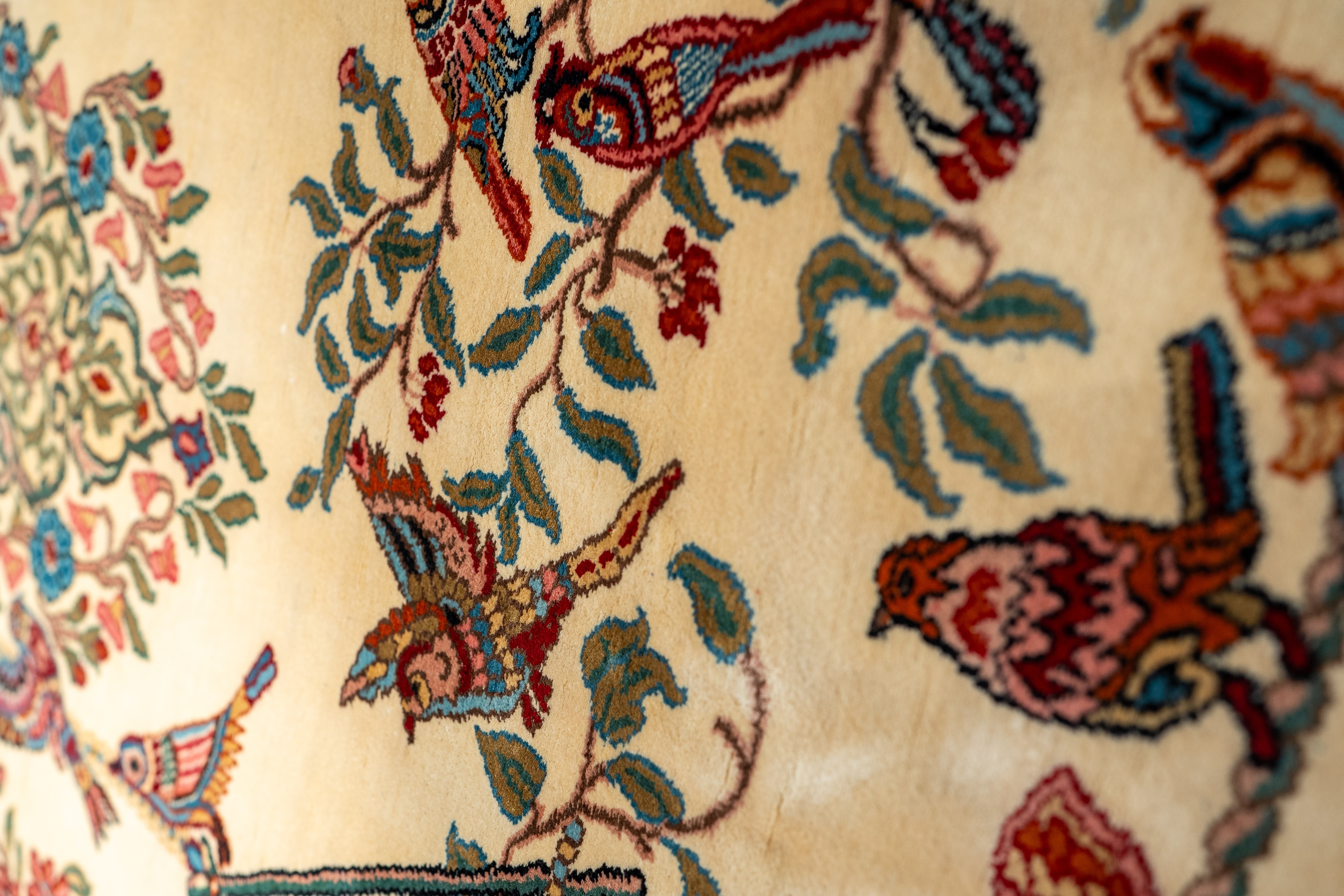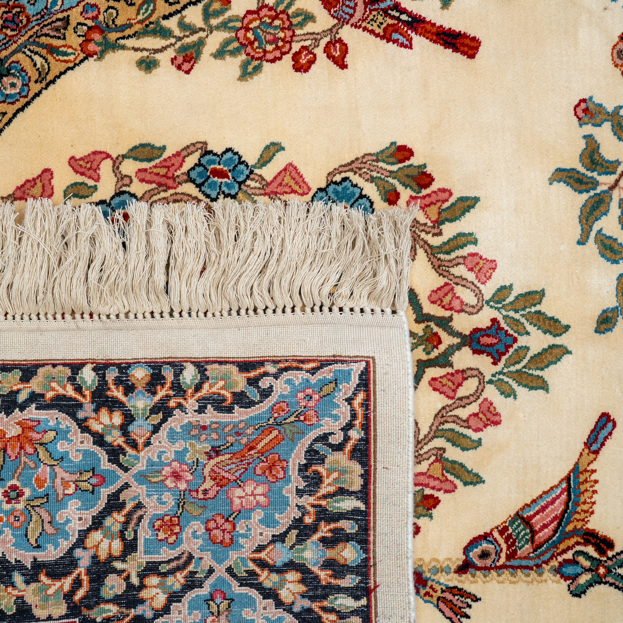 This hand-knotted pictorial carpet unfolds as a tranquil sanctuary where birds gather in harmony beneath flowering branches. Arranged across delicate perches and vine-laden limbs, each bird is rendered with remarkable clarity, transforming the composition into a living tapestry of movement and repose.