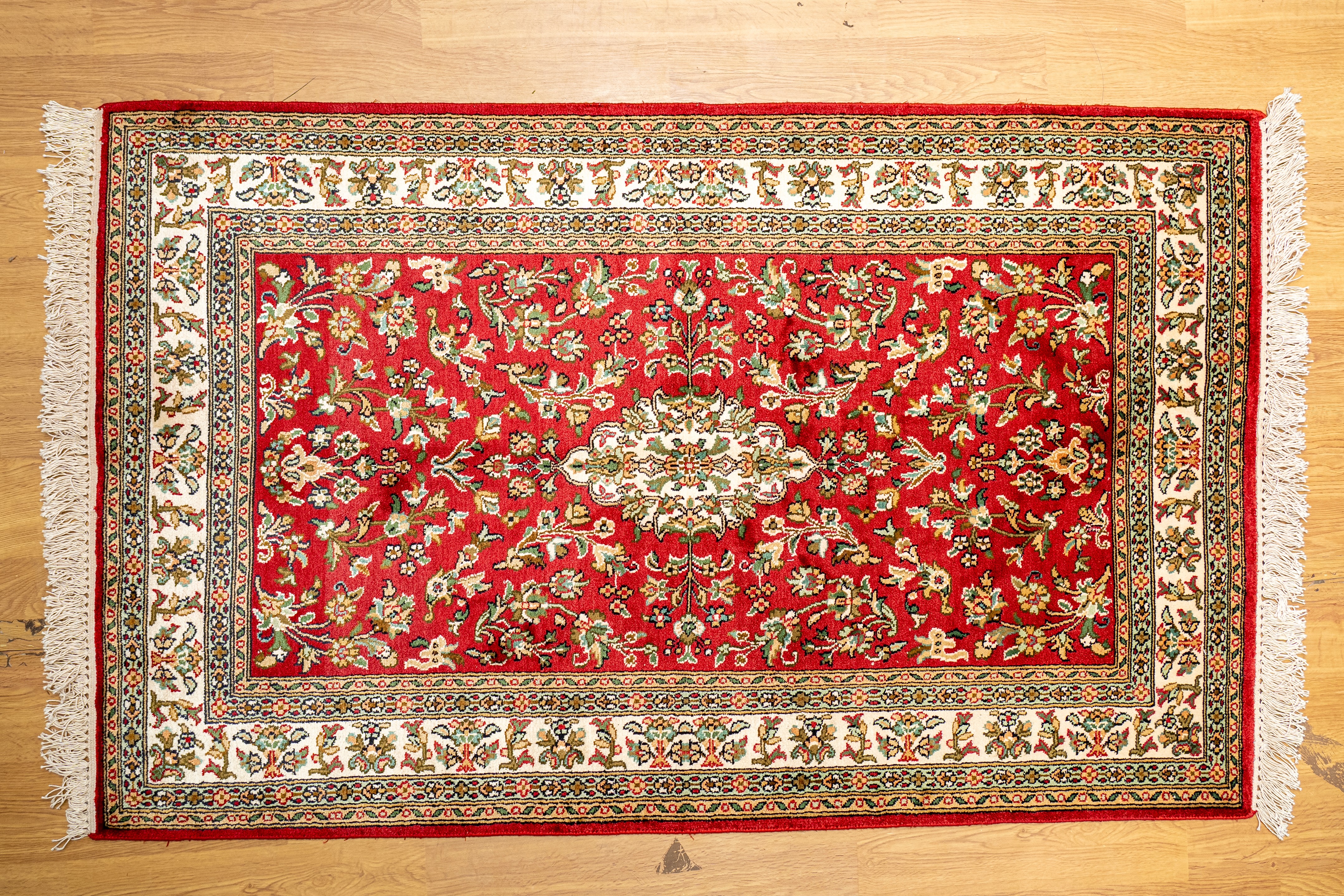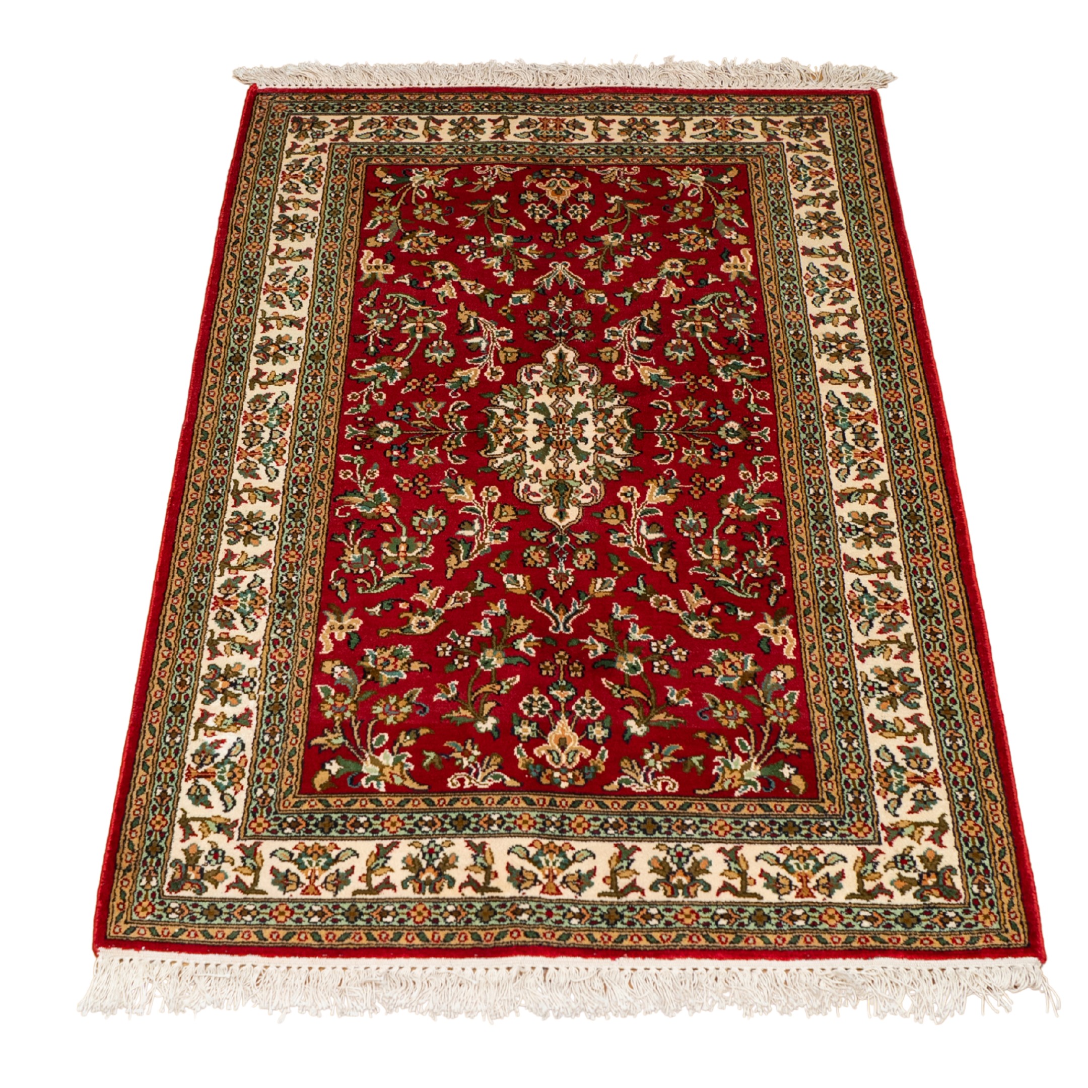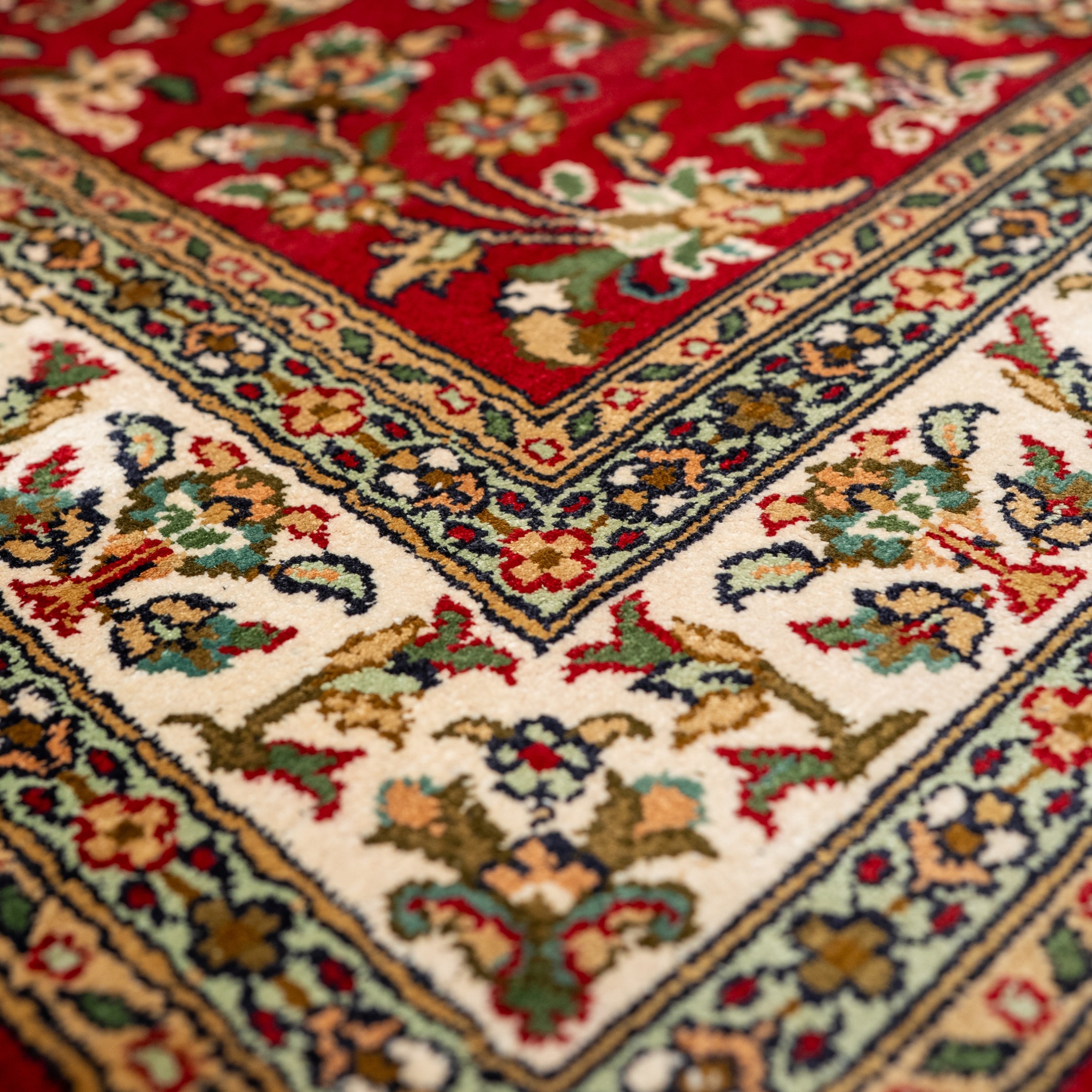 This hand-knotted carpet features a rich crimson field adorned with flowing floral vines and a delicately shaped central medallion that brings focus and balance to the composition. The intricate botanical detailing unfolds evenly across the surface, creating a sense of depth and continuity that reflects classical Persian-inspired design traditions.