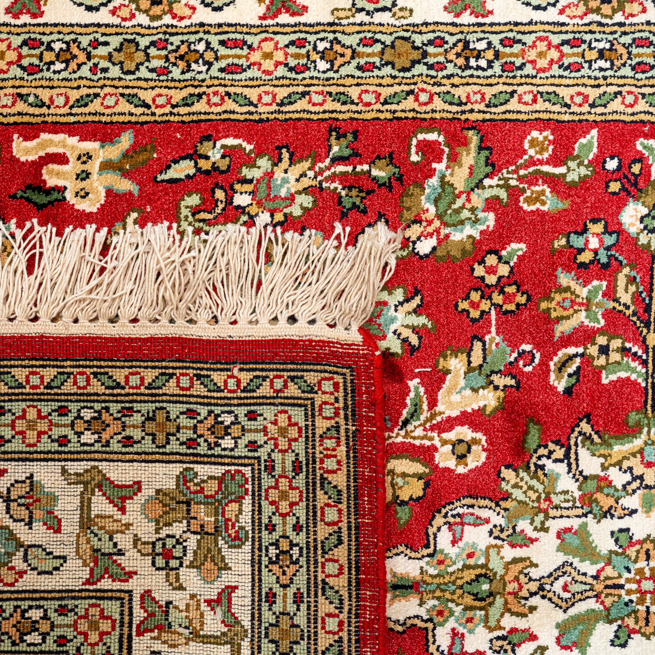 Framed by layered borders in soft ivory, olive, and muted gold tones, the carpet achieves a refined contrast that enhances its visual warmth. Carefully woven by skilled artisans, it offers a dense, elegant texture and enduring appeal. Well suited for formal living spaces, traditional interiors, or luxury hospitality settings, this piece adds character, richness, and timeless sophistication to any environment.