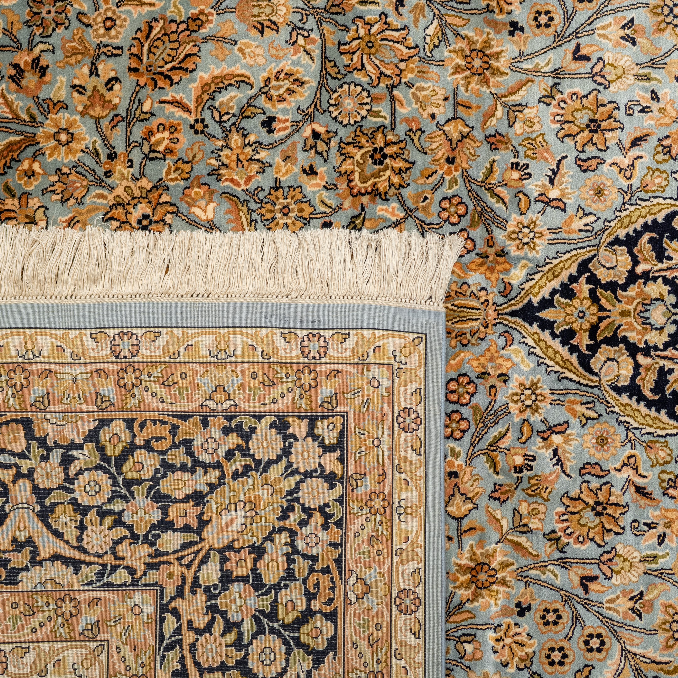 Surrounding borders introduce contrast through repeating botanical motifs and subtle tonal variation, lending structure and visual rhythm to the composition. Crafted by skilled artisans, the carpet offers a dense, even surface and a dignified presence suited to formal living spaces, heritage interiors, or luxury hospitality environments. Its classic design language ensures enduring appeal while allowing it to integrate seamlessly into both traditional and refined contemporary settings.