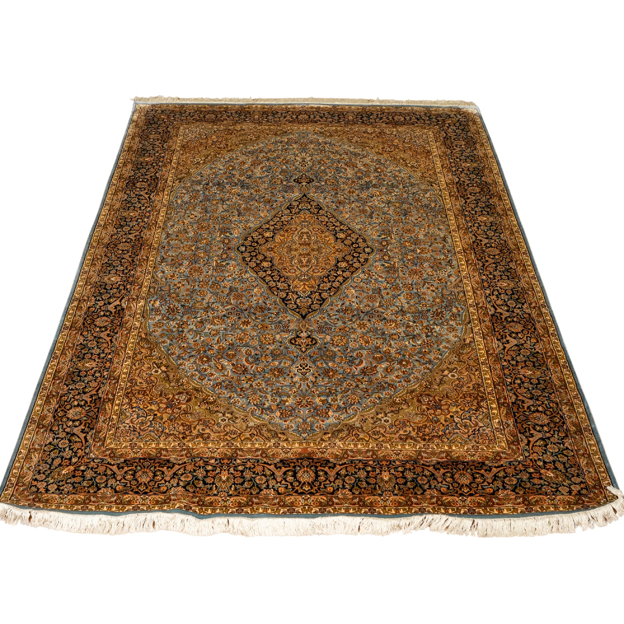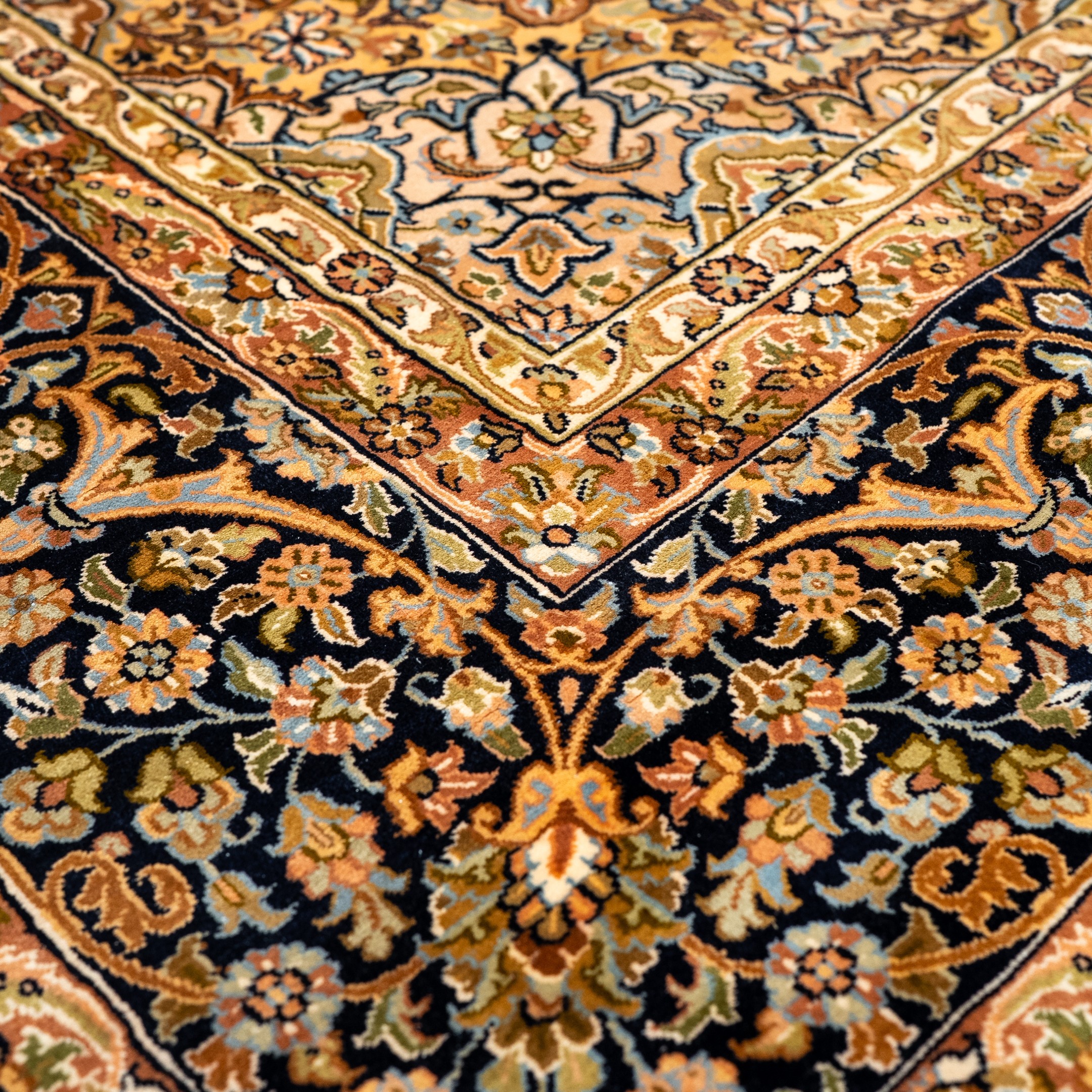 This hand-knotted carpet is composed around a refined central medallion resting on a deep indigo ground, where floral elements are arranged with controlled symmetry and measured spacing. The design carries a composed, stately character, balancing richness with clarity through well-defined outlines and carefully layered detailing.