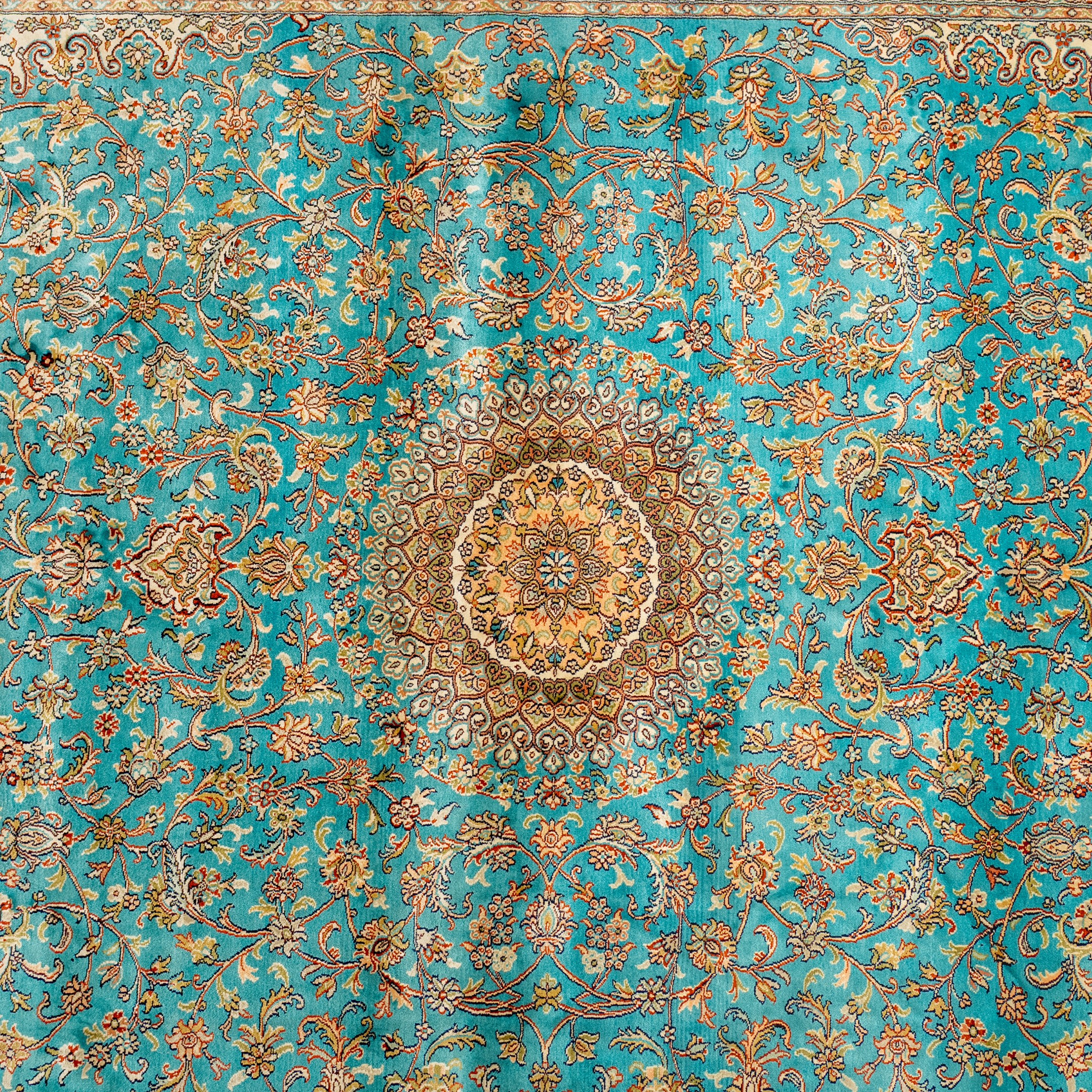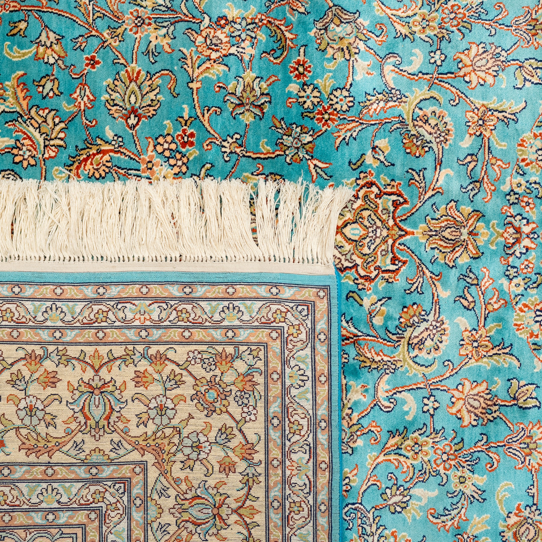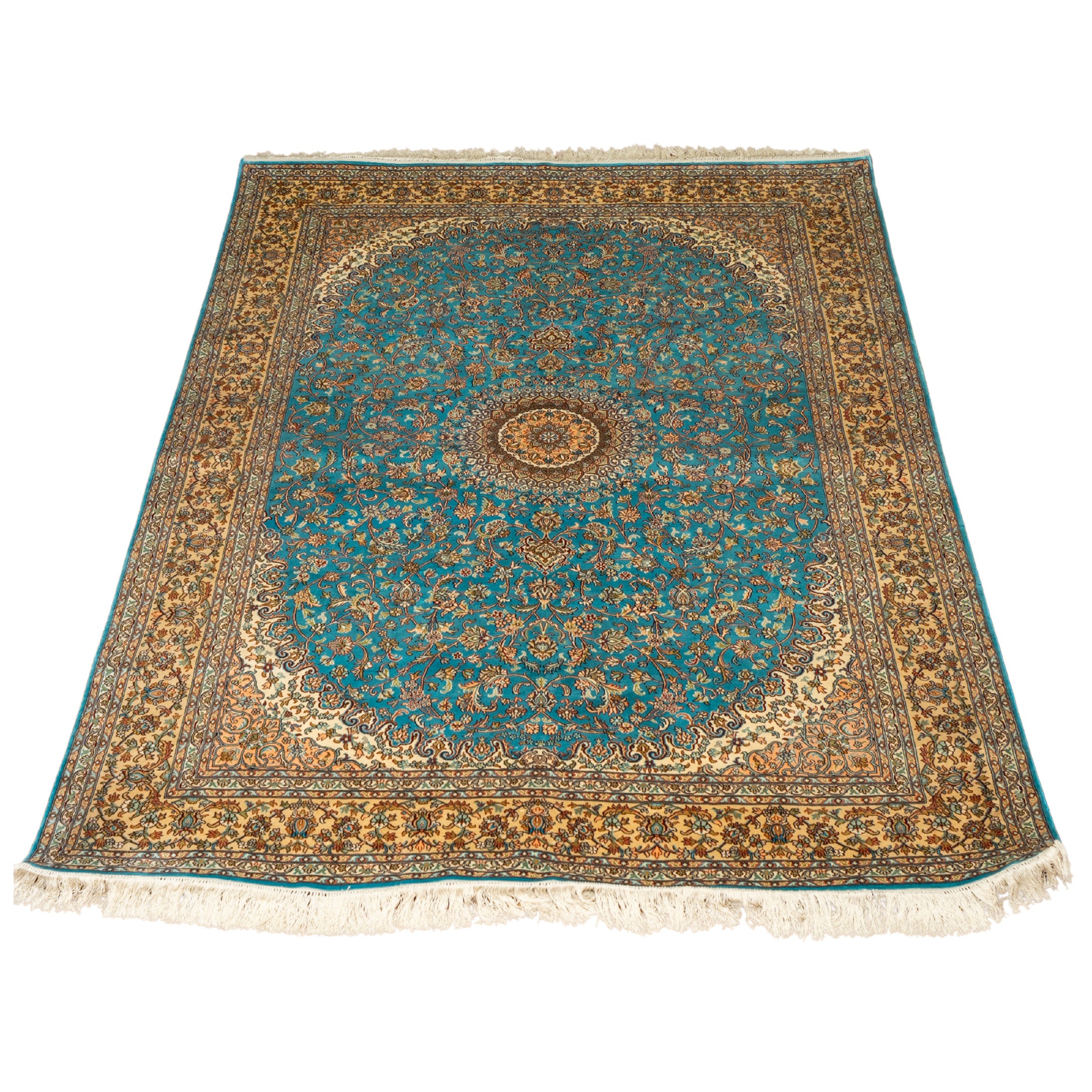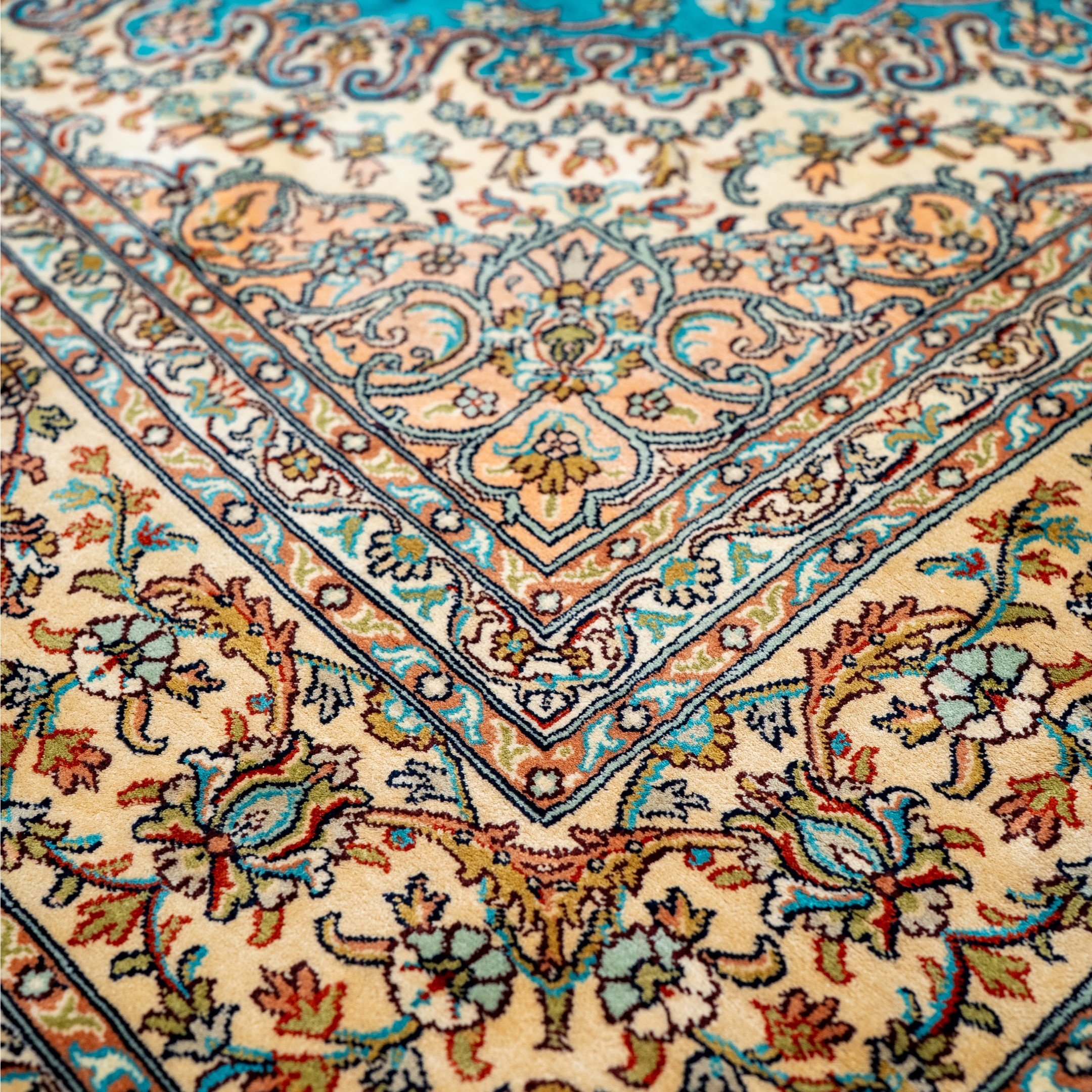 This hand-knotted carpet is a refined study in balance, symmetry, and color harmony. A luminous blue field unfolds at the center, anchored by an intricately layered medallion that radiates outward in delicate floral geometry. Each vine, blossom, and curve is meticulously articulated, creating a sense of depth that feels both structured and fluid.