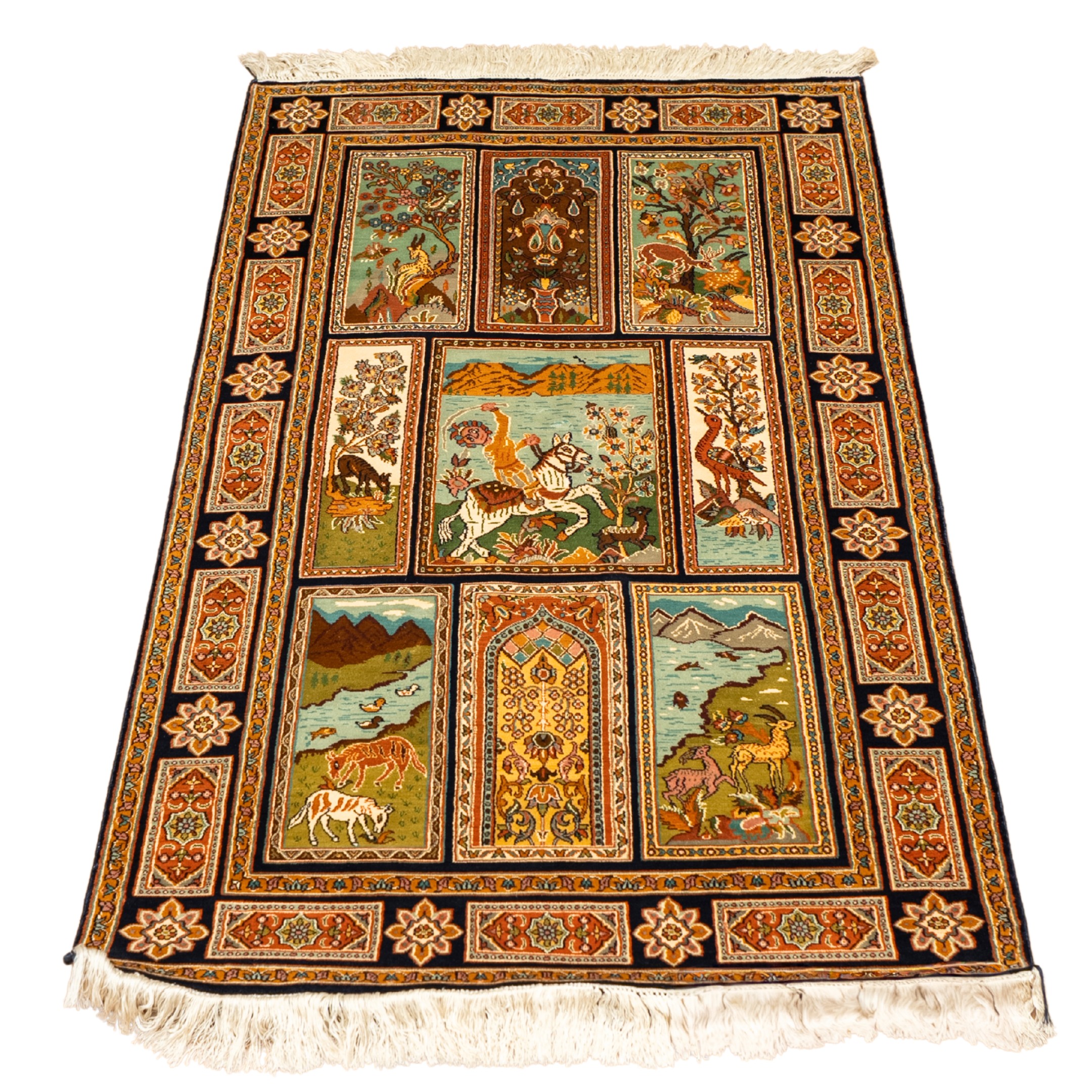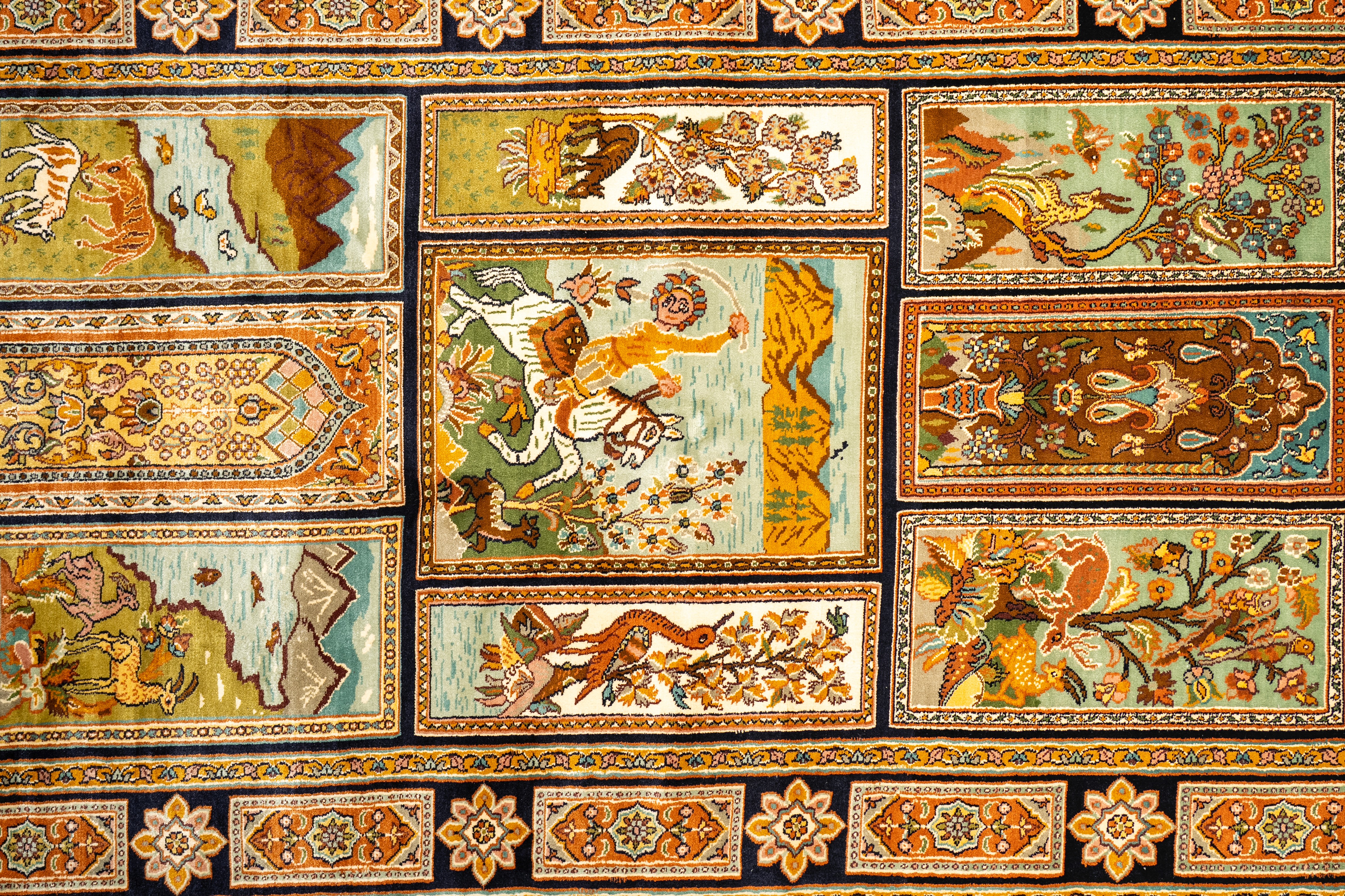 This hand-knotted carpet unfolds like a visual manuscript, composed of individually framed scenes that come together to form a unified narrative. Each panel presents a distinct moment—lush flora, roaming wildlife, flowing rivers, distant mountains, and architectural elements—while the central motif of a royal horseman anchors the composition with movement and authority.