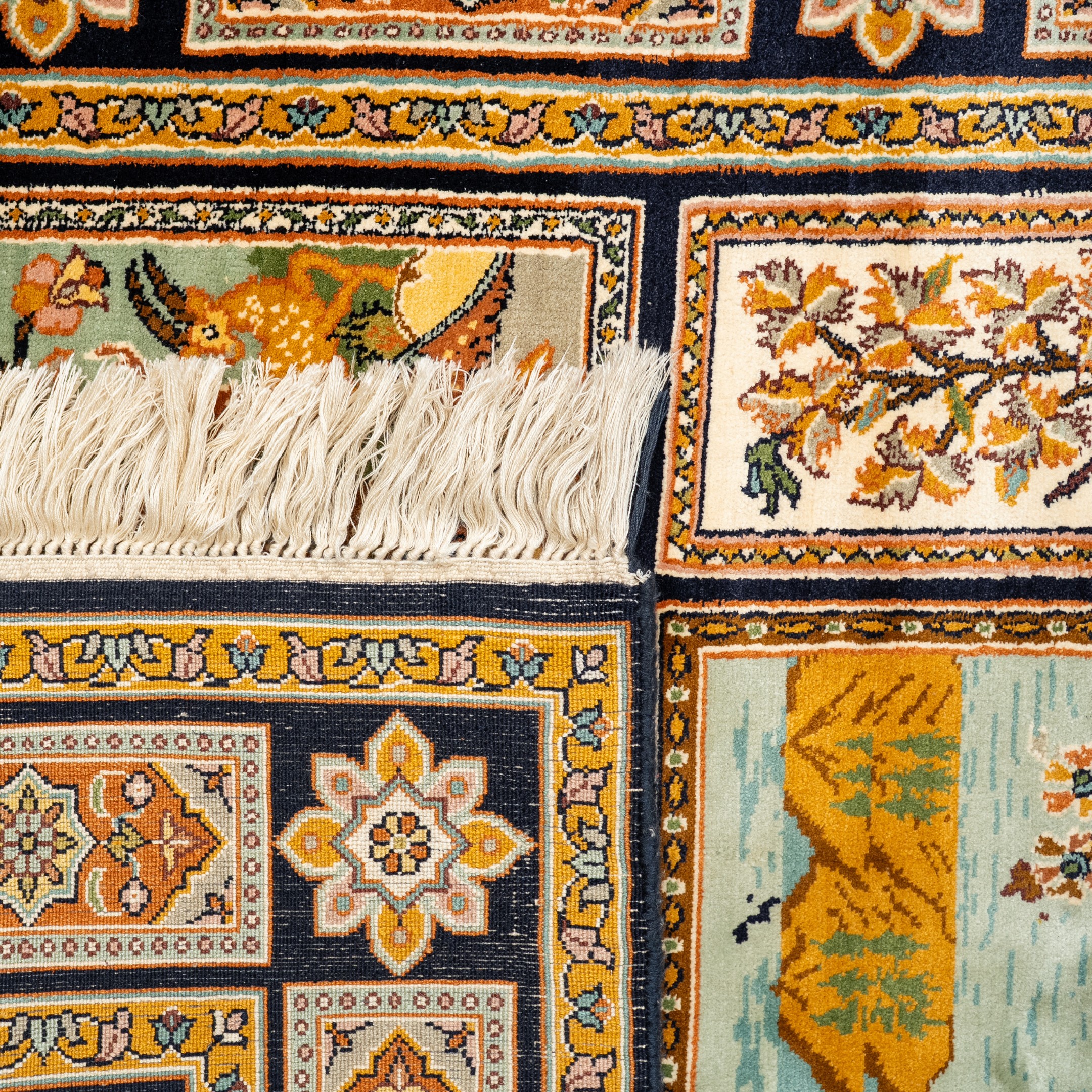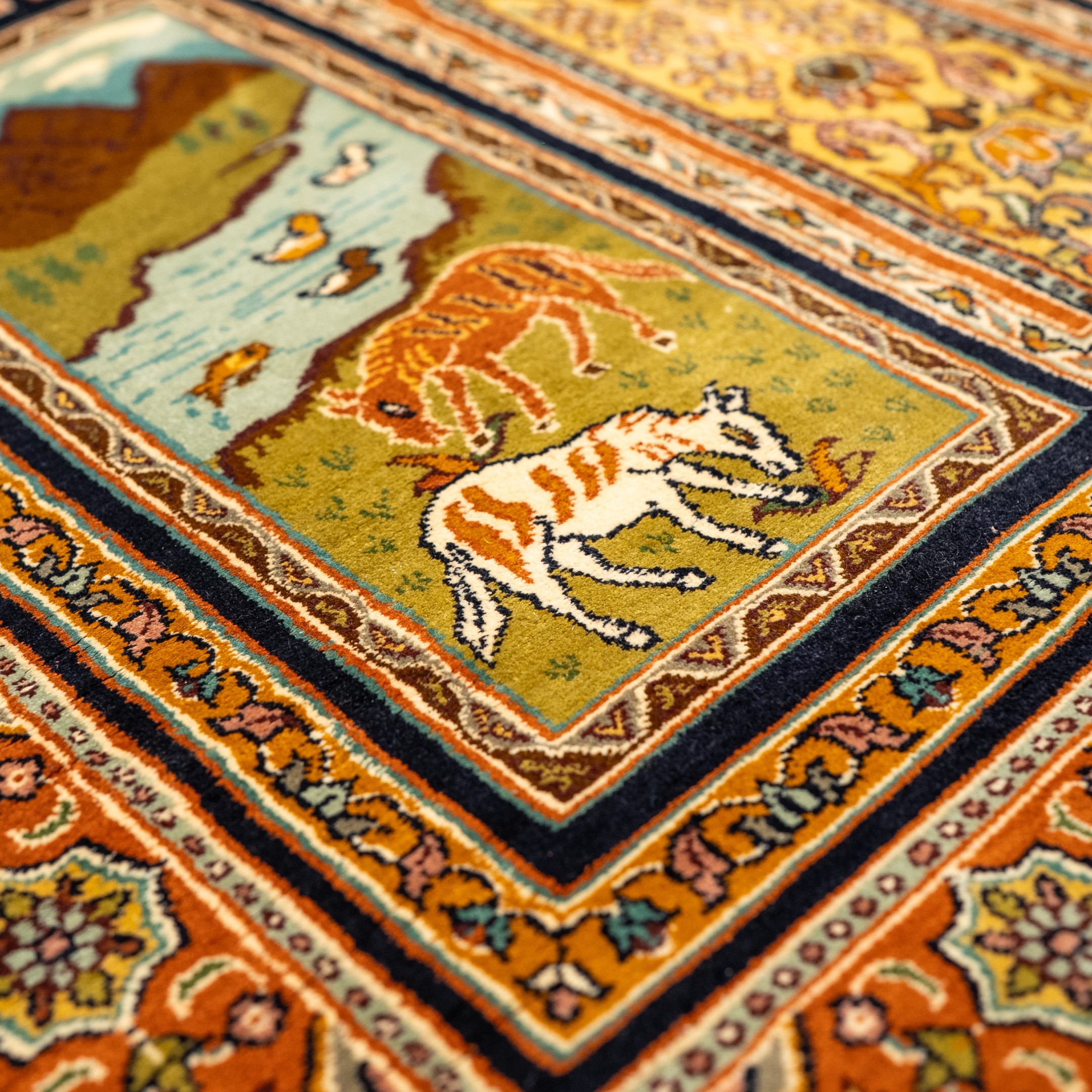 The design draws inspiration from classical miniature storytelling, where nature, journey, and nobility coexist in harmony. Crafted with exceptional attention to detail by skilled artisans, the carpet reveals fine line work, layered colors, and precise articulation across every vignette. Its structured layout and richly ornamented borders give the piece a gallery-like presence, making it ideal for statement interiors, collector spaces, or heritage settings. This carpet is not merely decorative; it is a woven narrative that invites exploration, reflection, and lasting admiration.