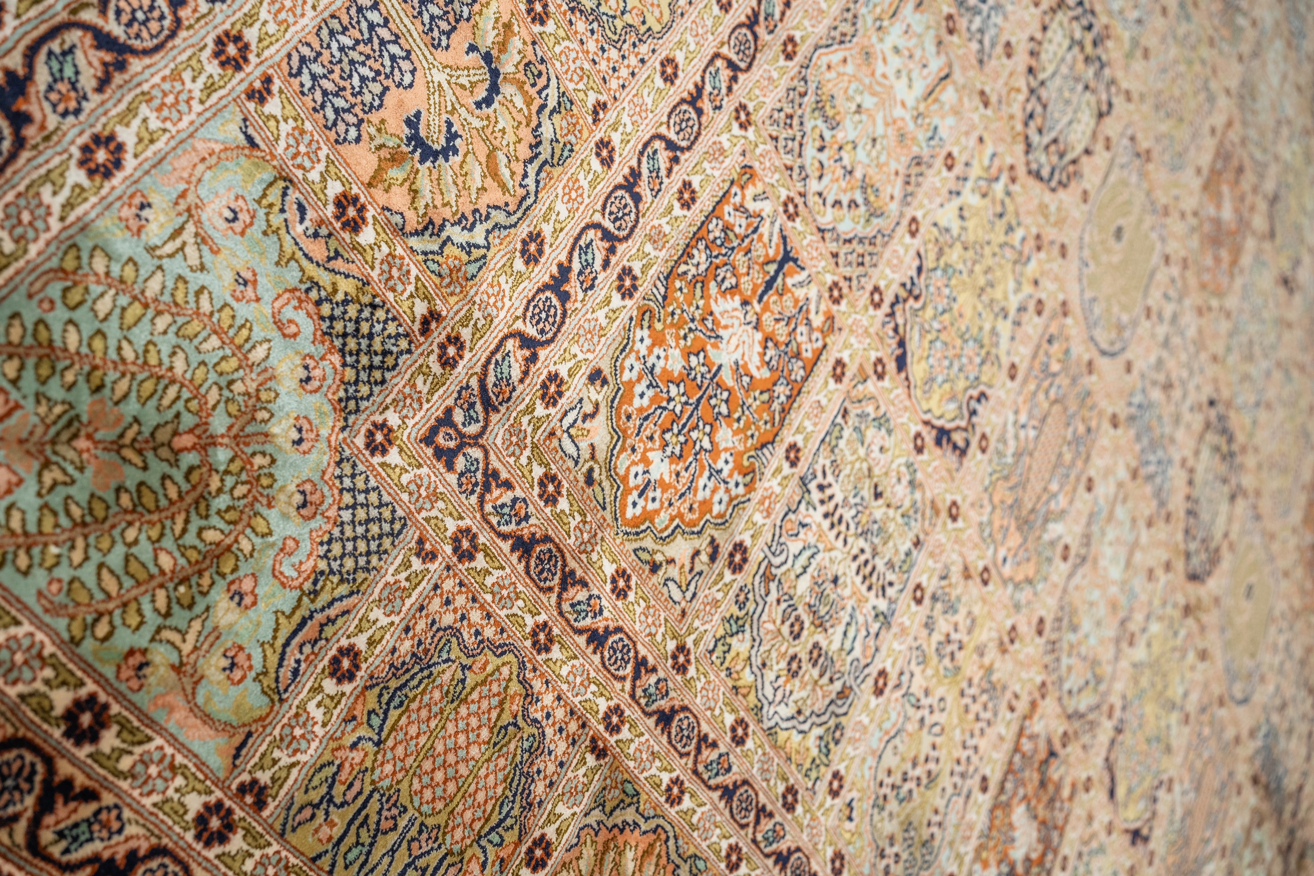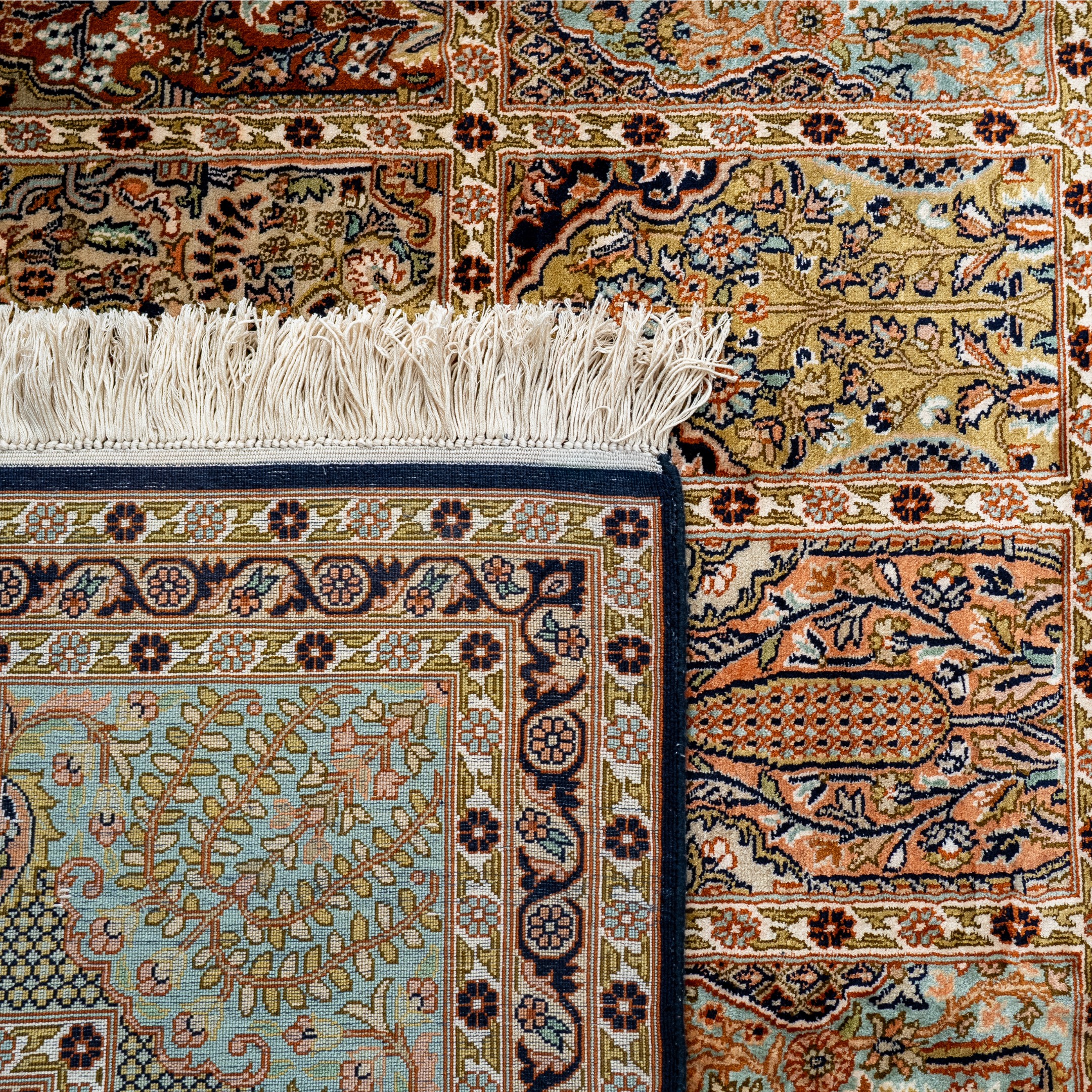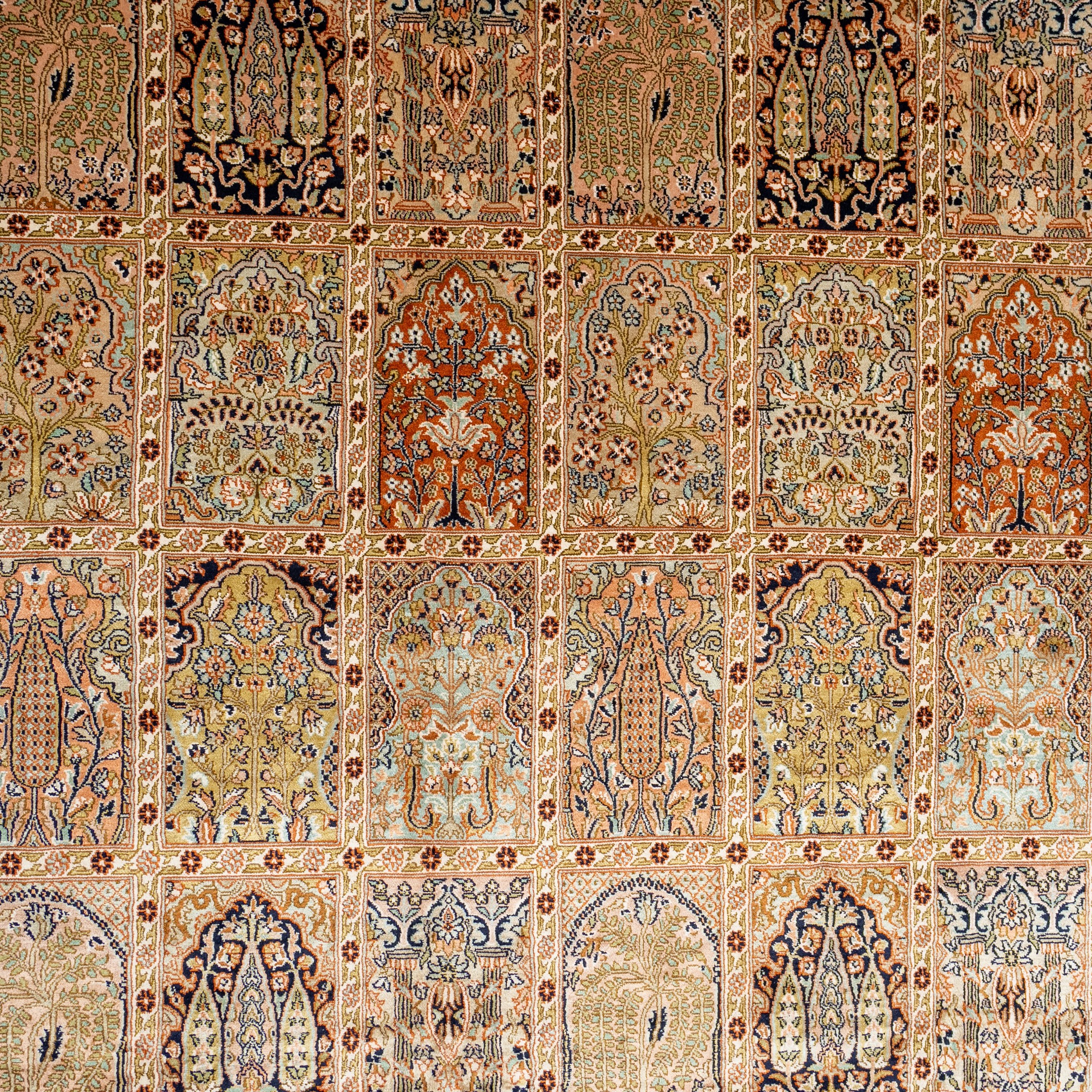 This hand-knotted carpet is defined by a softly illuminated central medallion set within an expansive ivory field, where finely articulated floral motifs radiate outward in measured harmony. The design feels open and balanced, allowing the intricacy of the pattern to be appreciated without visual heaviness.