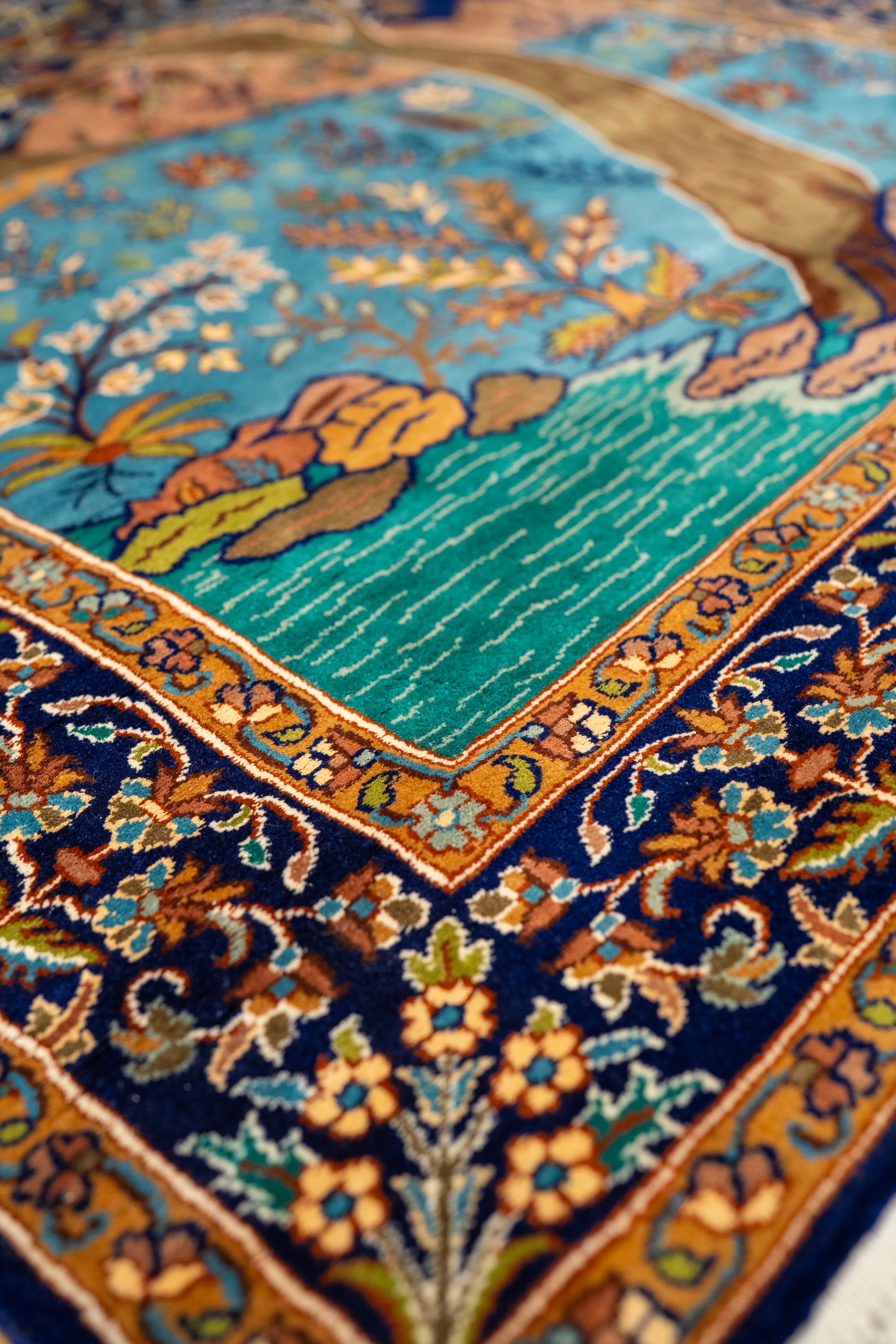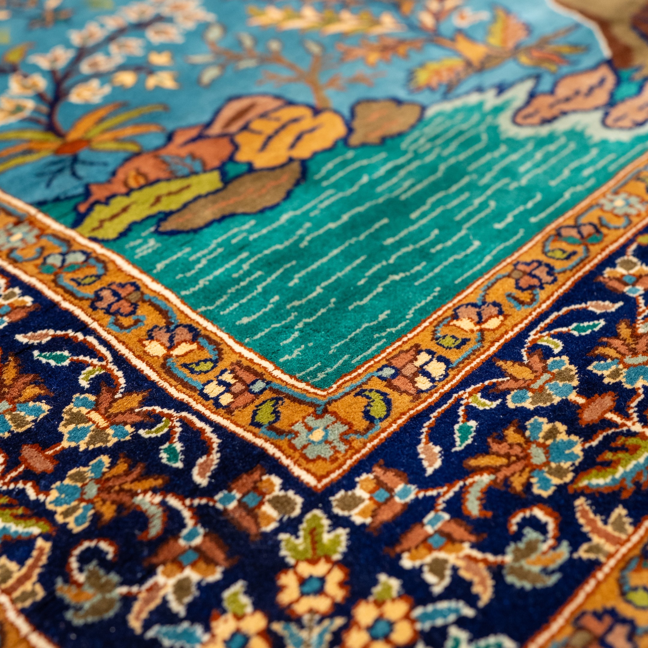 Meticulously crafted by skilled artisans using premium-quality fibers, the carpet showcases fine detailing in the foliage, water plants, and textured terrain. The rich blue background enhances depth and contrast, while the ornate floral border frames the scene with elegance. Ideal as a statement piece for living spaces, studies, galleries, or luxury hospitality interiors, this carpet transcends decoration to become a woven expression of tranquility and timeless craftsmanship.