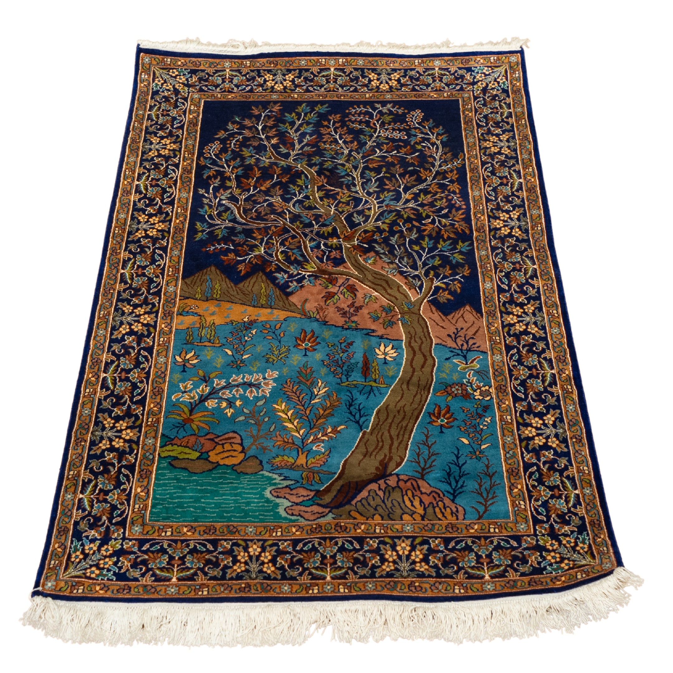 This exquisite hand-knotted carpet depicts a serene natural landscape centered around a graceful tree growing beside a flowing water body, set against distant hills and a deep blue sky. The composition reflects harmony between earth, water, and life, symbolizing growth, calm, and continuity found in classical nature-inspired art.