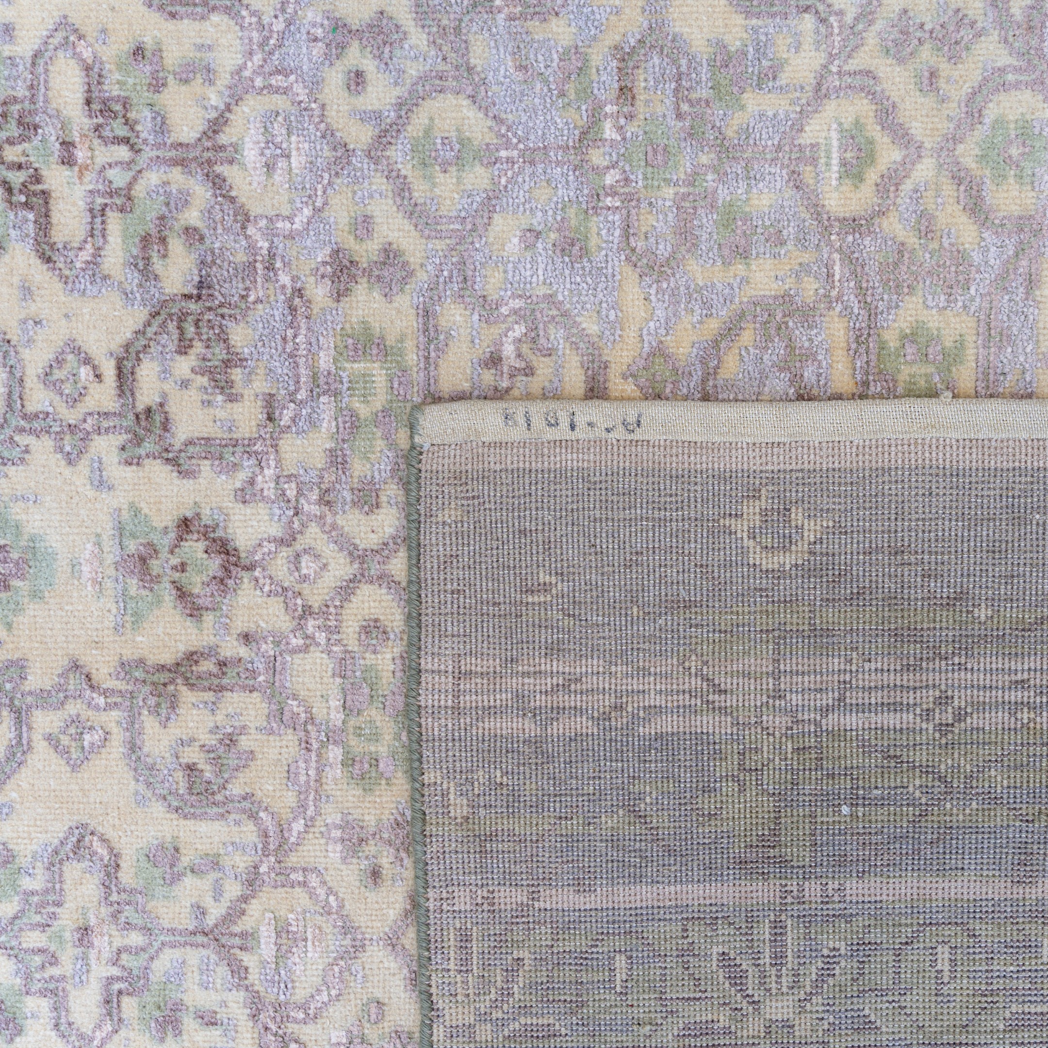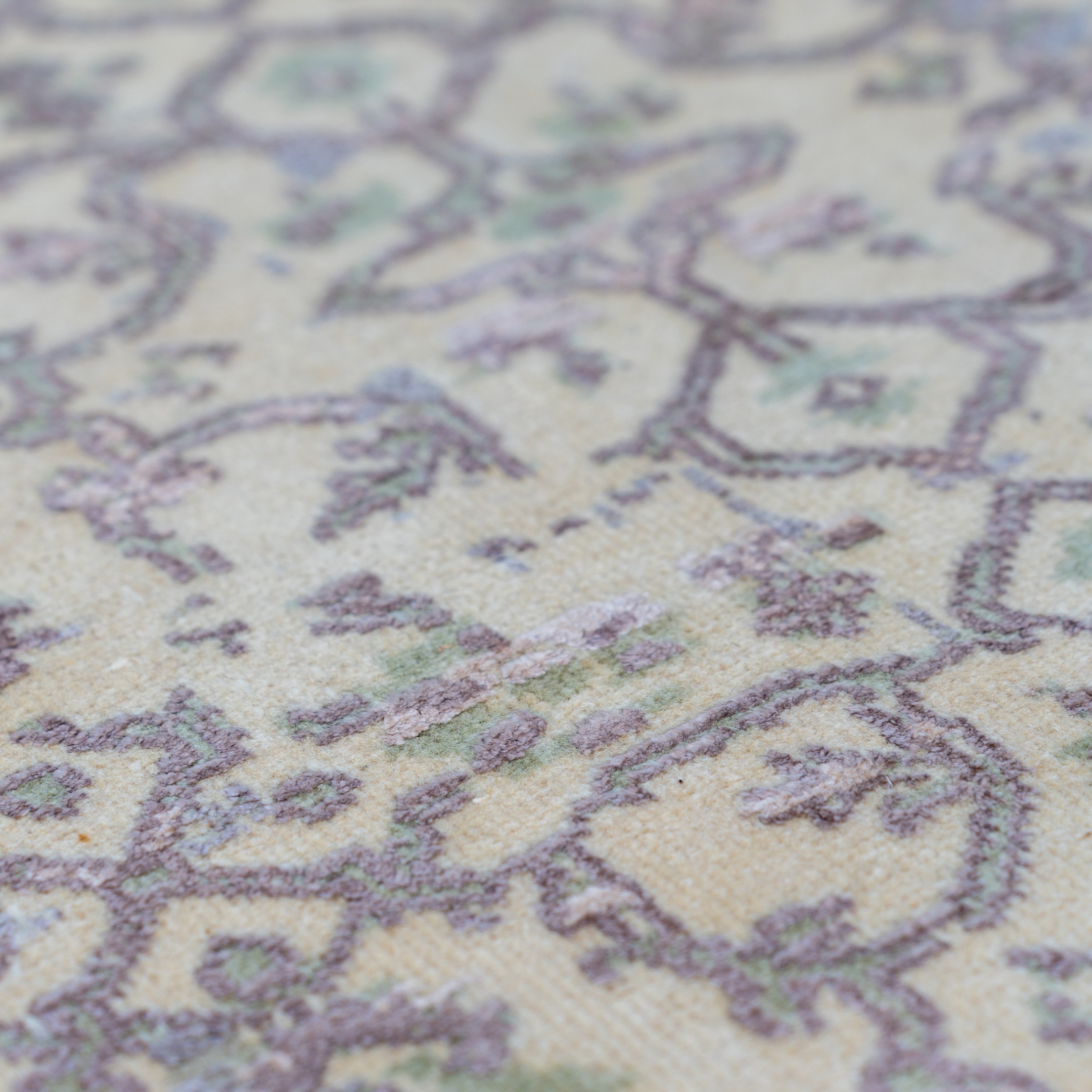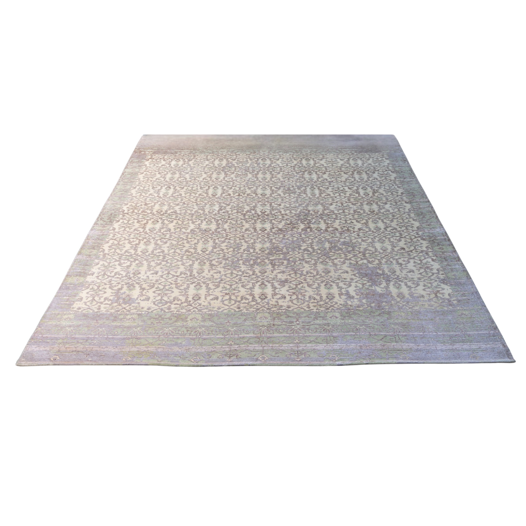 This hand-knotted rug embodies understated elegance with its soft, muted color palette and classic design. The piece features a sophisticated repeating floral lattice pattern, reminiscent of traditional damask textiles, rendered in pale tones of sage green and soft grey against a creamy, off-white background. The entire composition has a gentle, faded quality, giving it a refined, antique character without heavy distressing. The subtle border design complements the central field, creating a cohesive and tranquil aesthetic perfect for a serene living space.