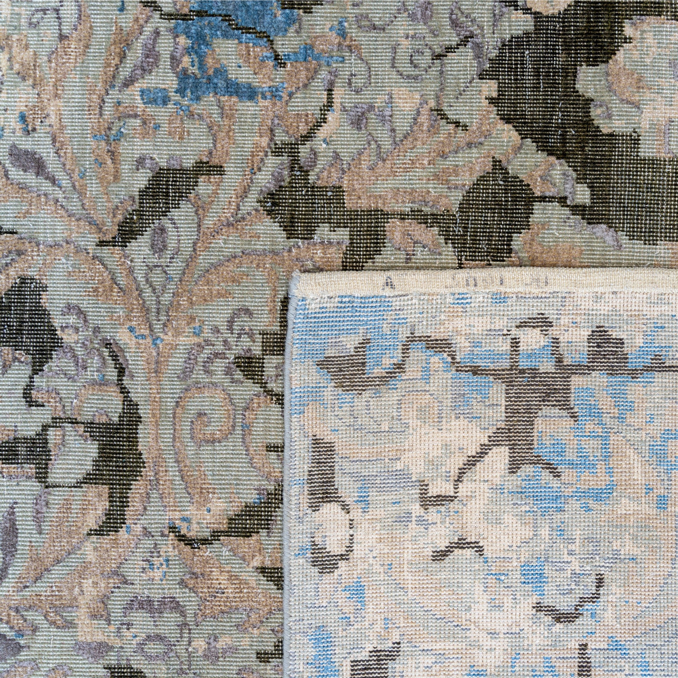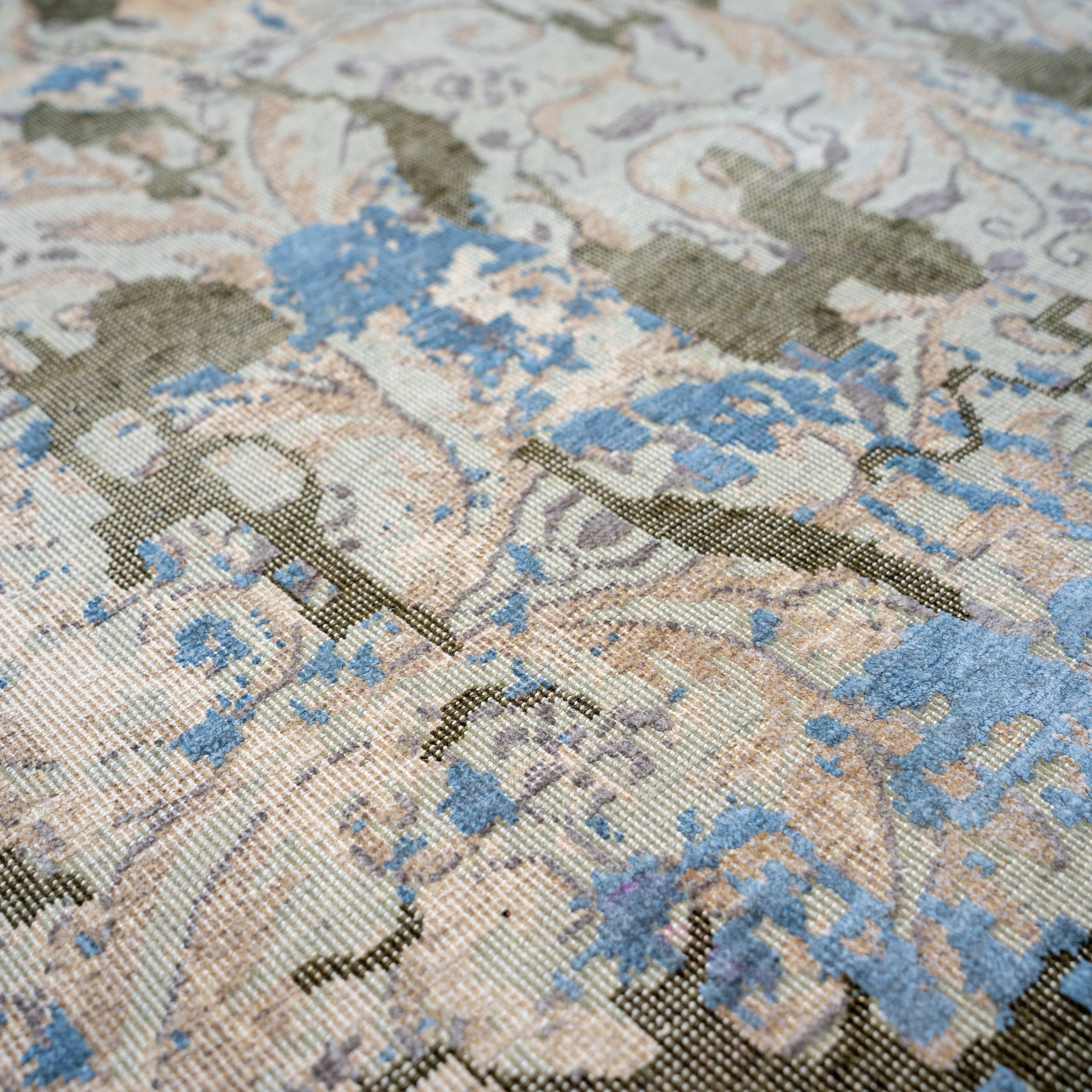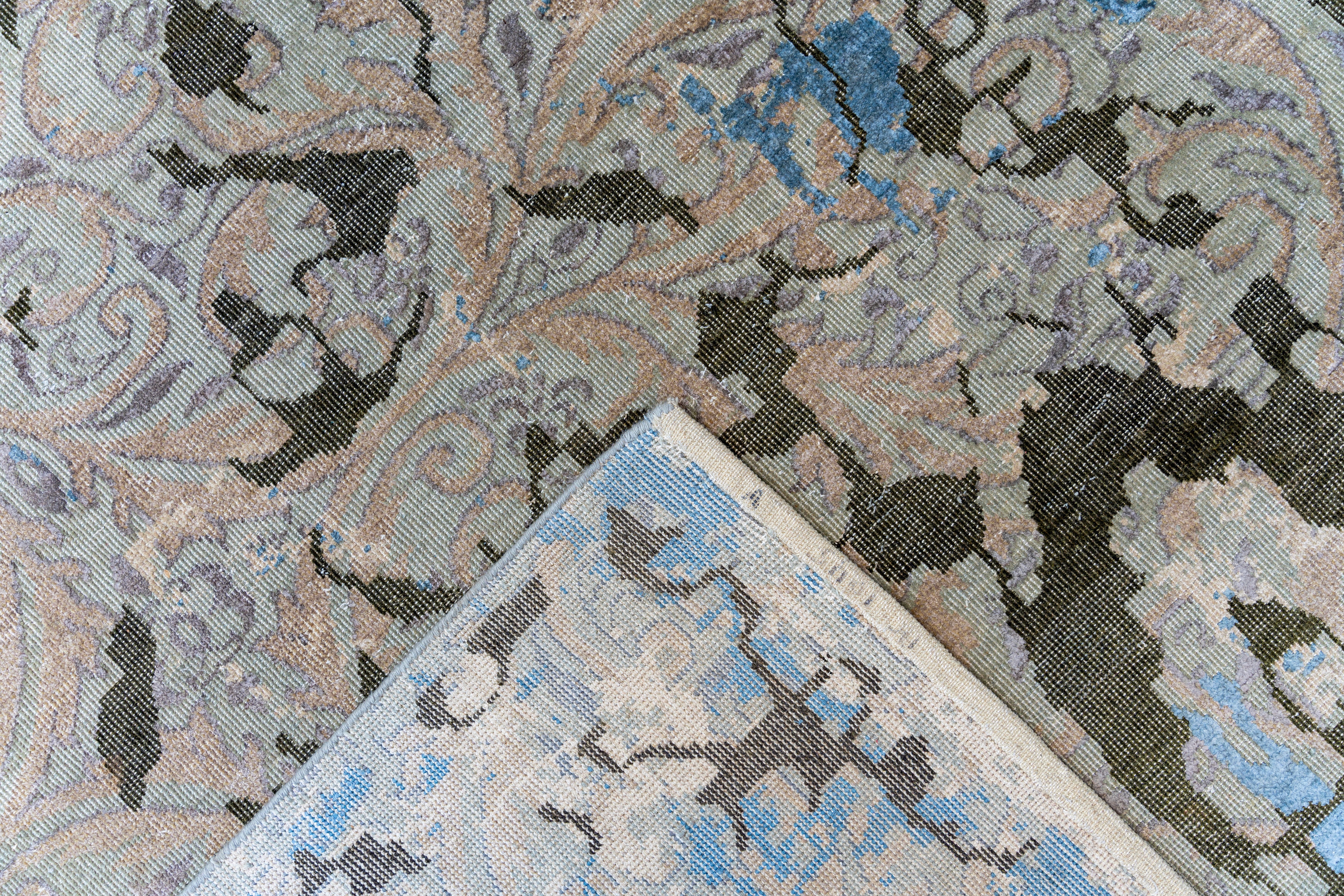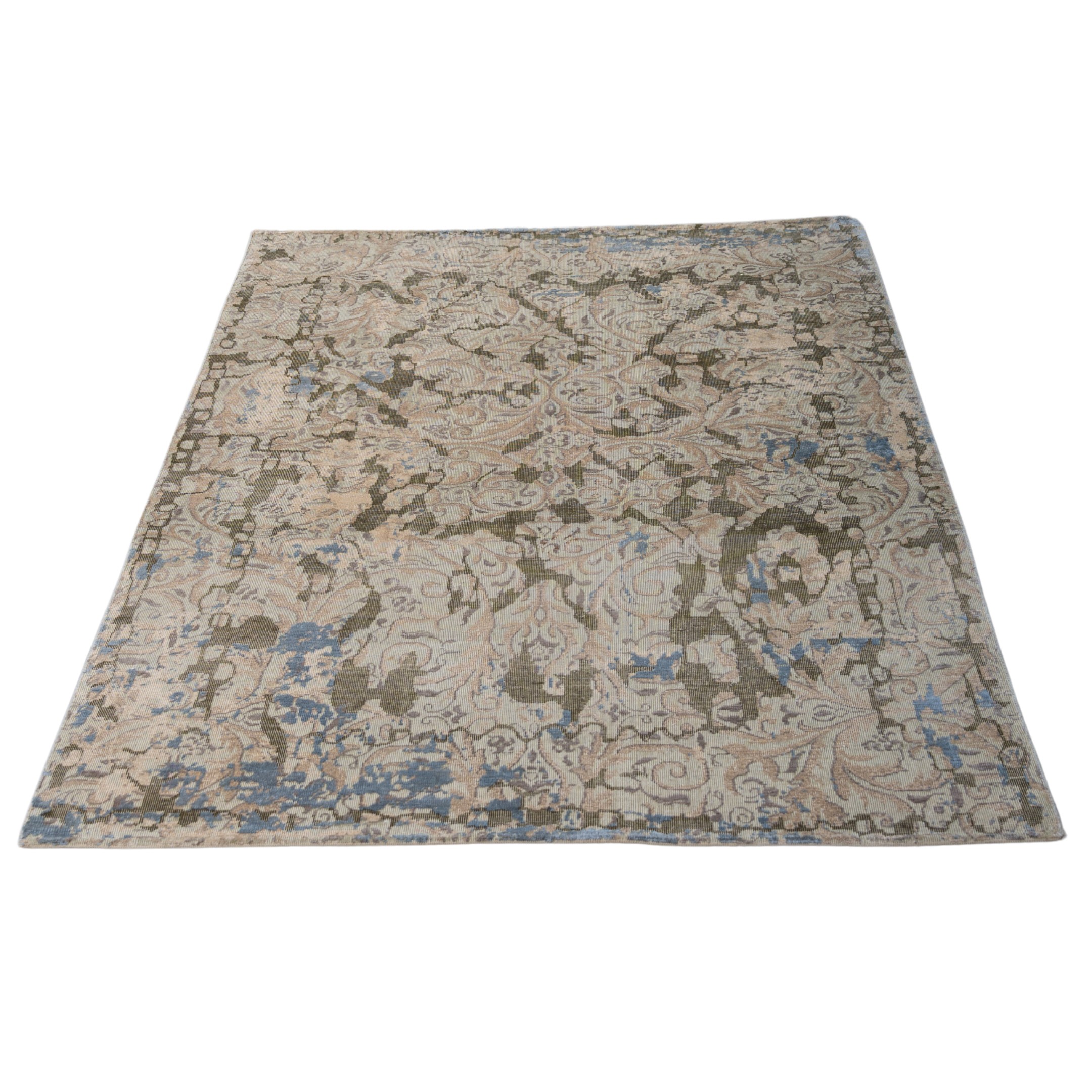 This avant-garde hand-knotted masterpiece redefines the concept of "distressed" design with a striking, architectural aesthetic. The rug features a cool, sophisticated palette of icy glacier blue, slate grey, and neutral beige, overlaid with jagged charcoal-black fissures that resemble cracked earth or weathered stone. Beneath this modern, "shattered" texture, faint ghostly outlines of a traditional scrolling floral pattern emerge and fade, suggesting a history hidden within the weave. The result is a dramatic fusion of ancient structure and urban industrial art, making it a perfect statement piece for a contemporary loft or a modern minimalist space.
