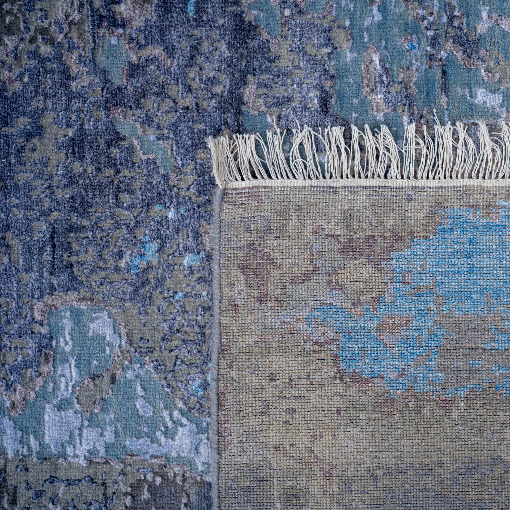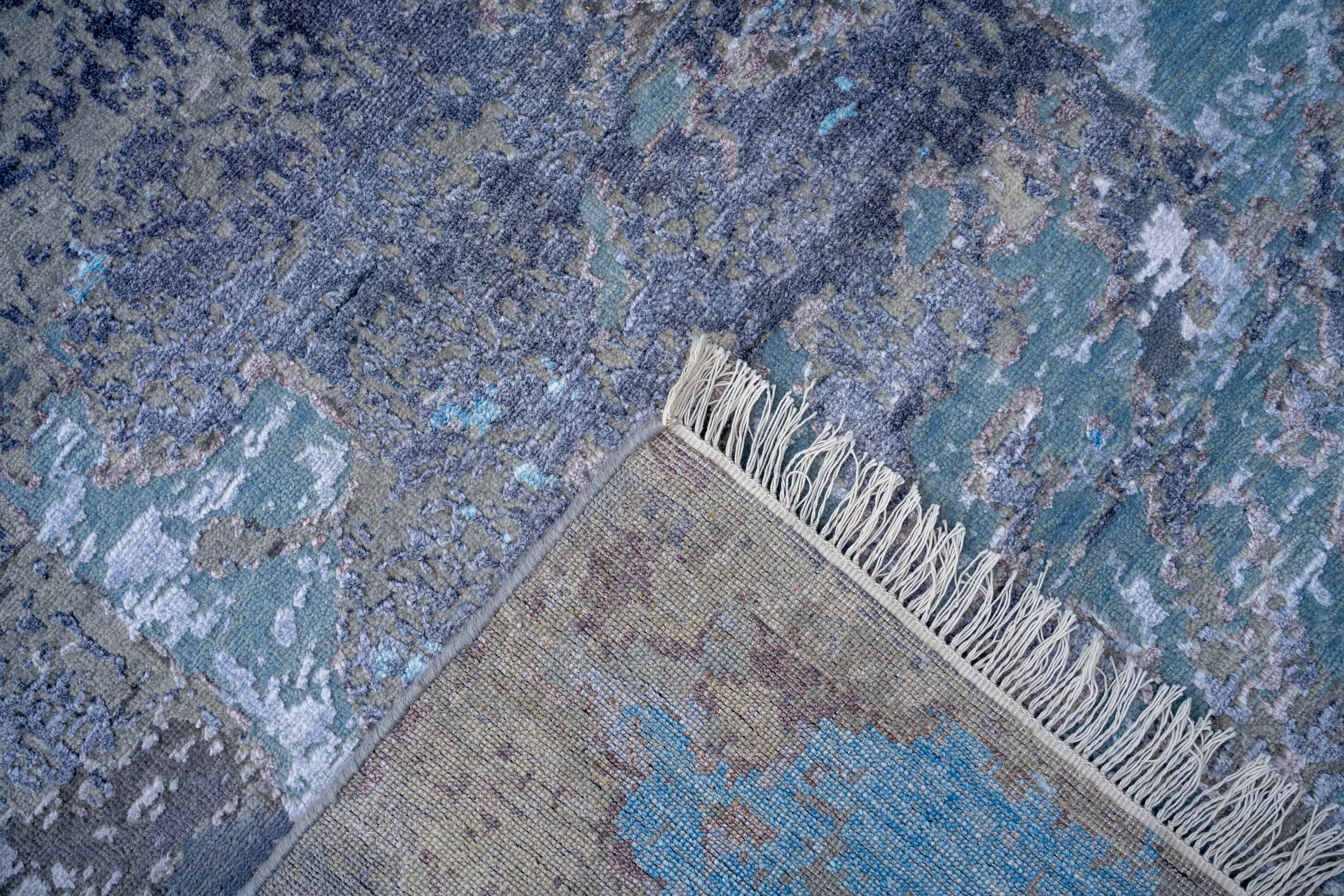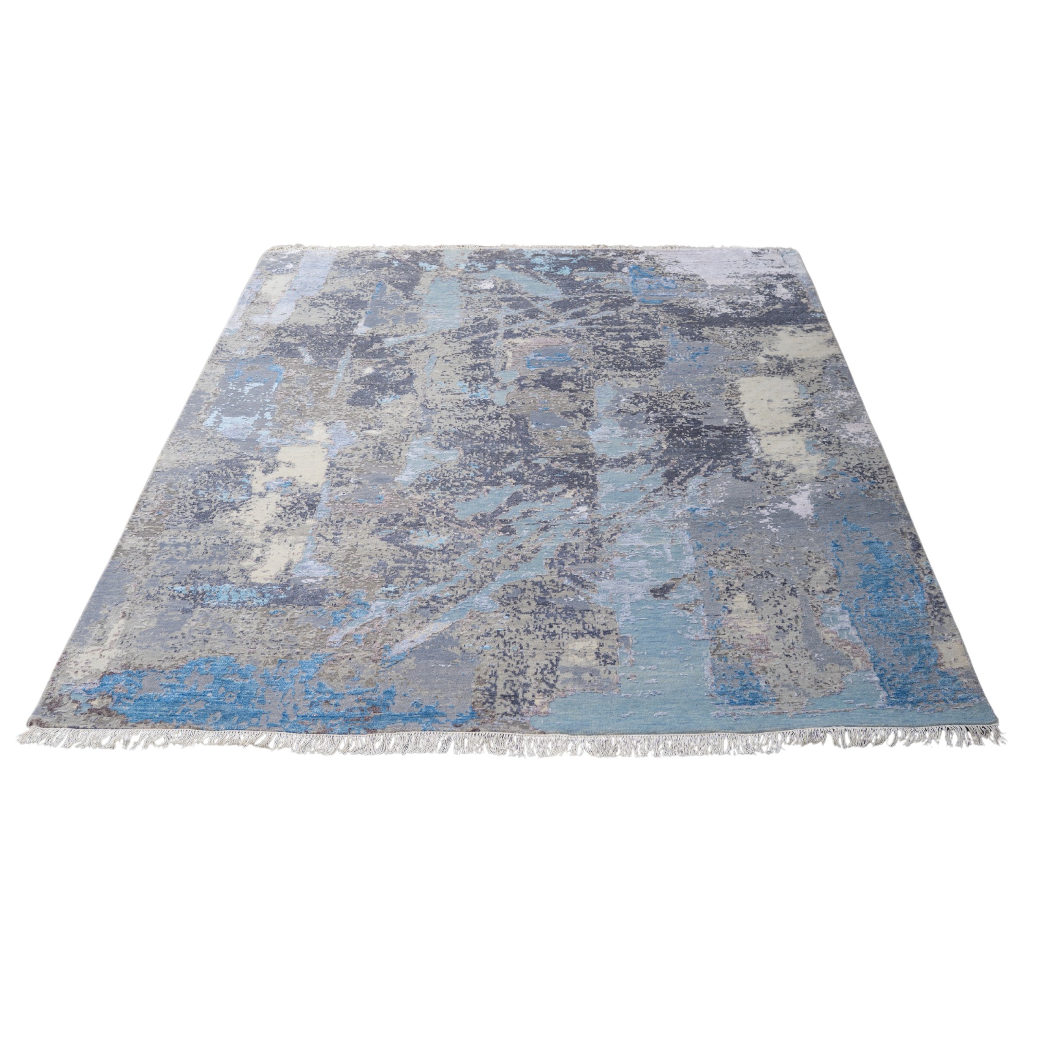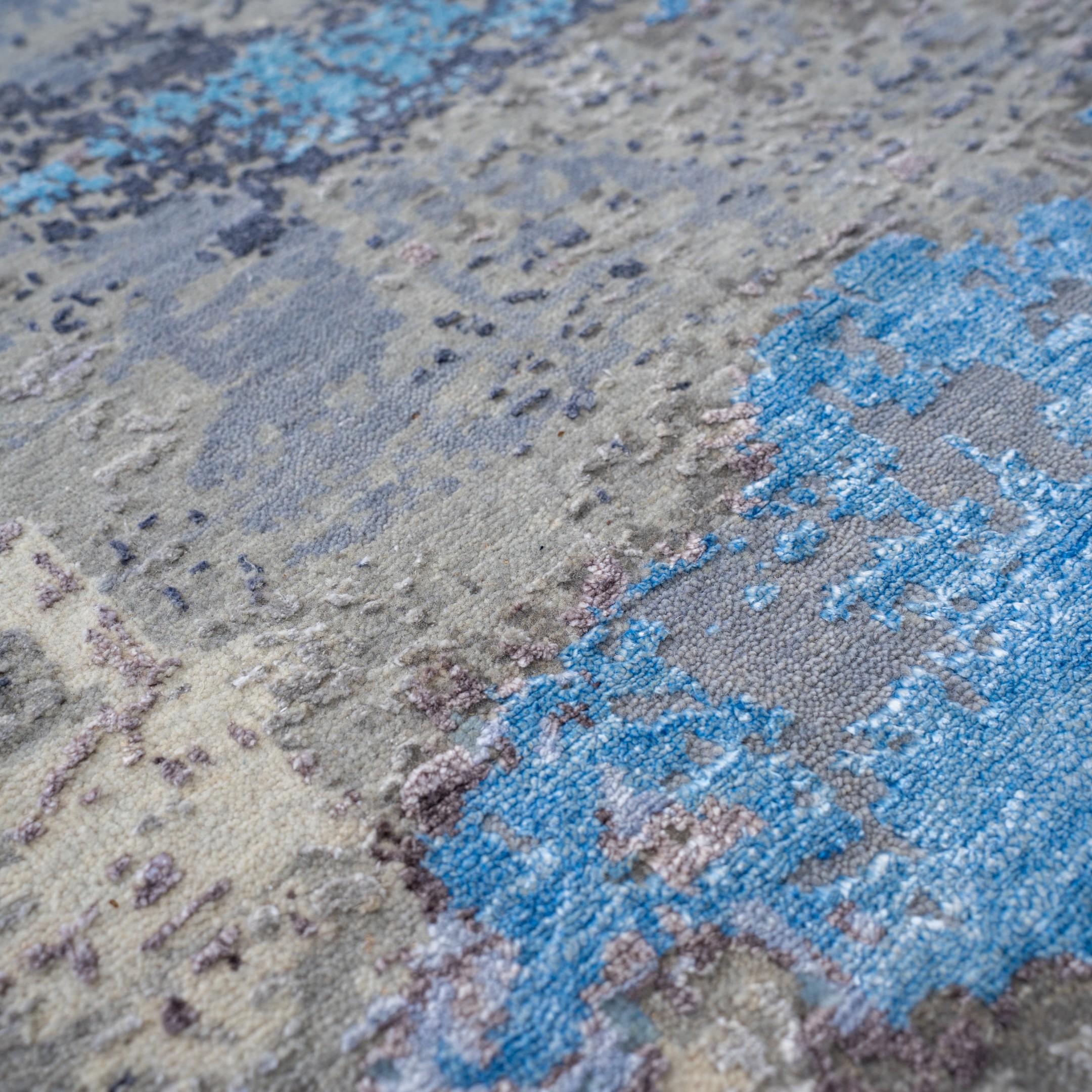 This contemporary hand-knotted masterpiece captures the ethereal beauty of a monsoon sky over the Indian landscape. The rug features a fluid, painterly design where washes of icy blue, deep indigo, and slate grey blend seamlessly into one another, resembling a watercolor painting or the rippled surface of a river. The design is purely abstract, devoid of traditional borders or motifs, allowing the rich variations in color and texture to create a sense of atmospheric depth and movement. Its cool, serene palette makes it a sophisticated "art piece" for the floor, perfect for modern minimalist interiors seeking a touch of tranquility.