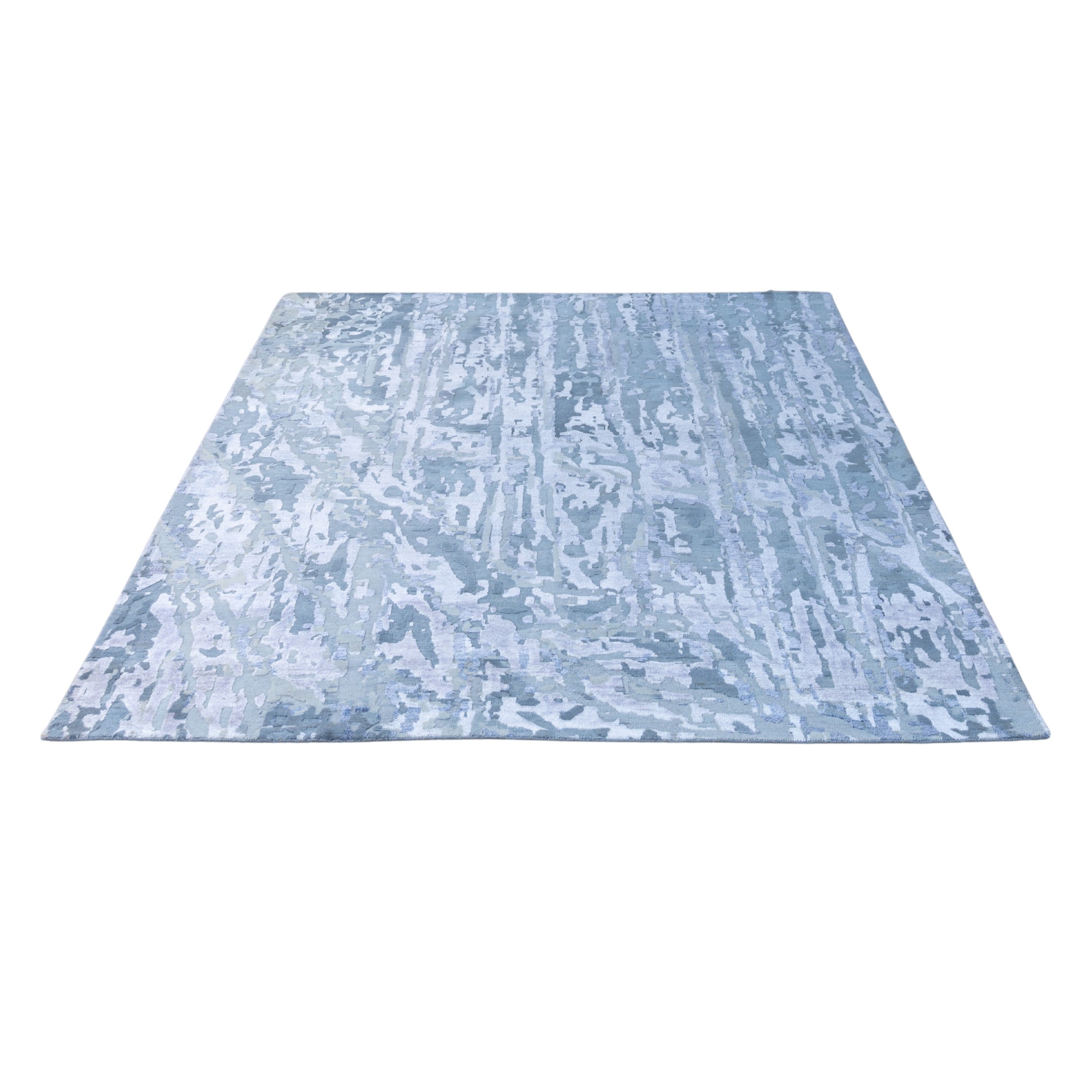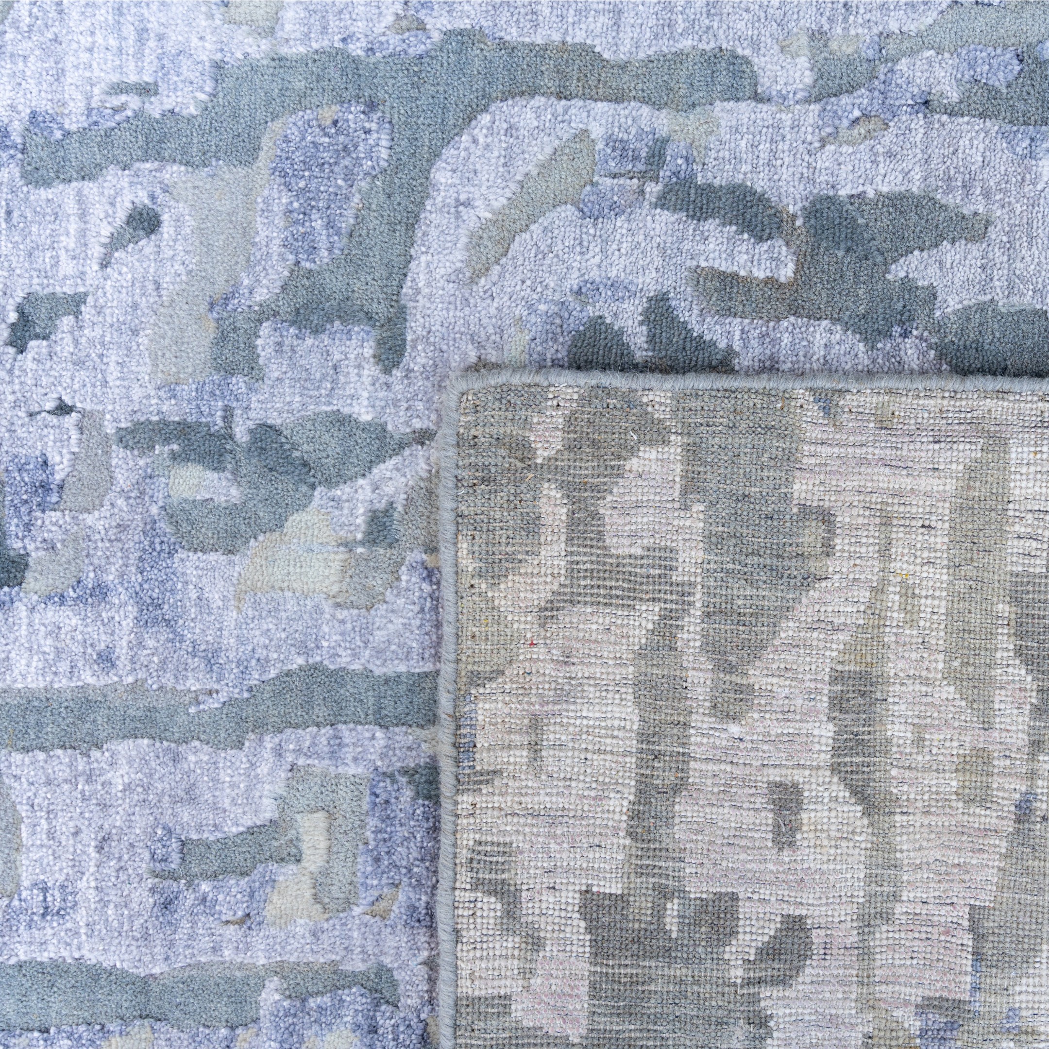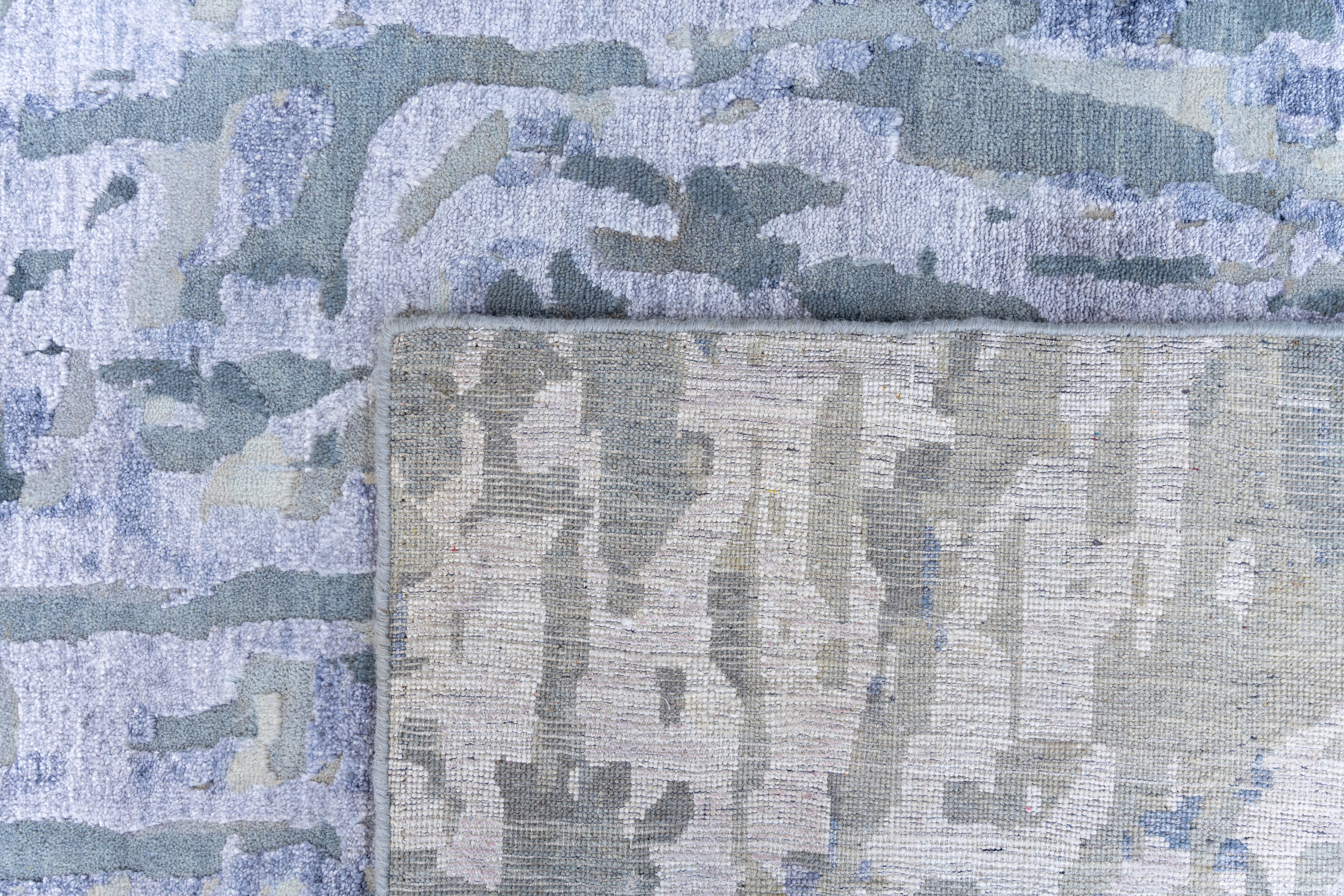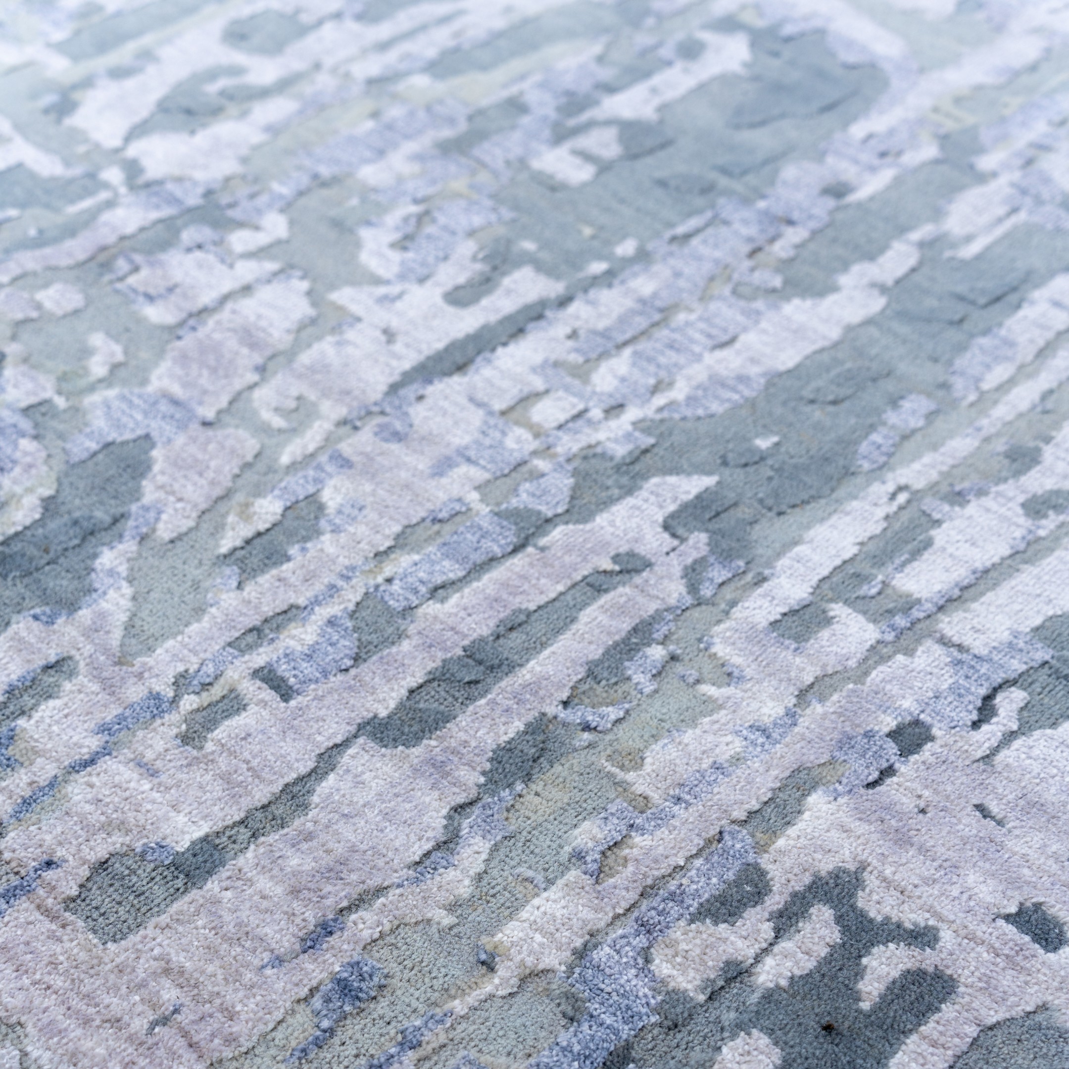 This contemporary hand-knotted carpet is a stunning example of abstract art designed for the floor. The piece is defined by a cool, sophisticated palette of deep indigos, slate blues, and muted greys , interspersed with striking vertical streaks of pale, icy white and silvery-lavender . The design is entirely organic and fluid, evoking images of cascading waterfalls, melting glacial ice, or the textured mineral deposits on a cliff face. The painterly transition of colors and the strong vertical movement create a sense of serene depth and flow, making it a calming yet dramatic focal point for a modern interior.