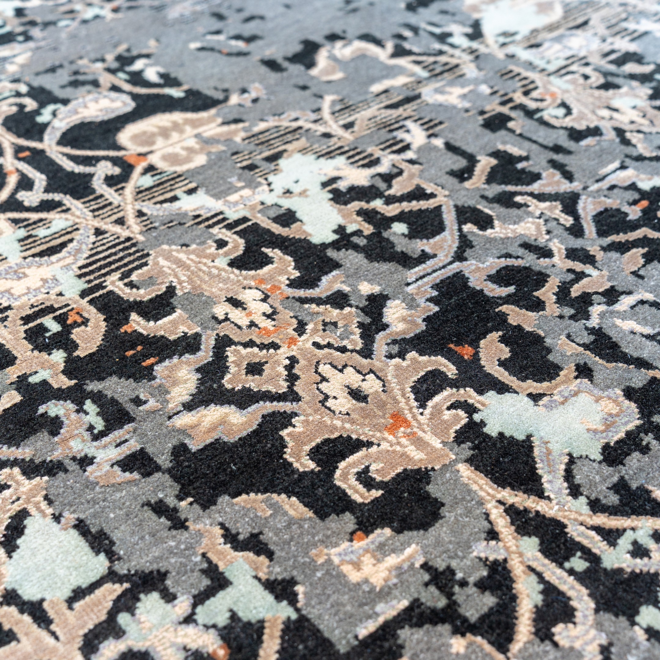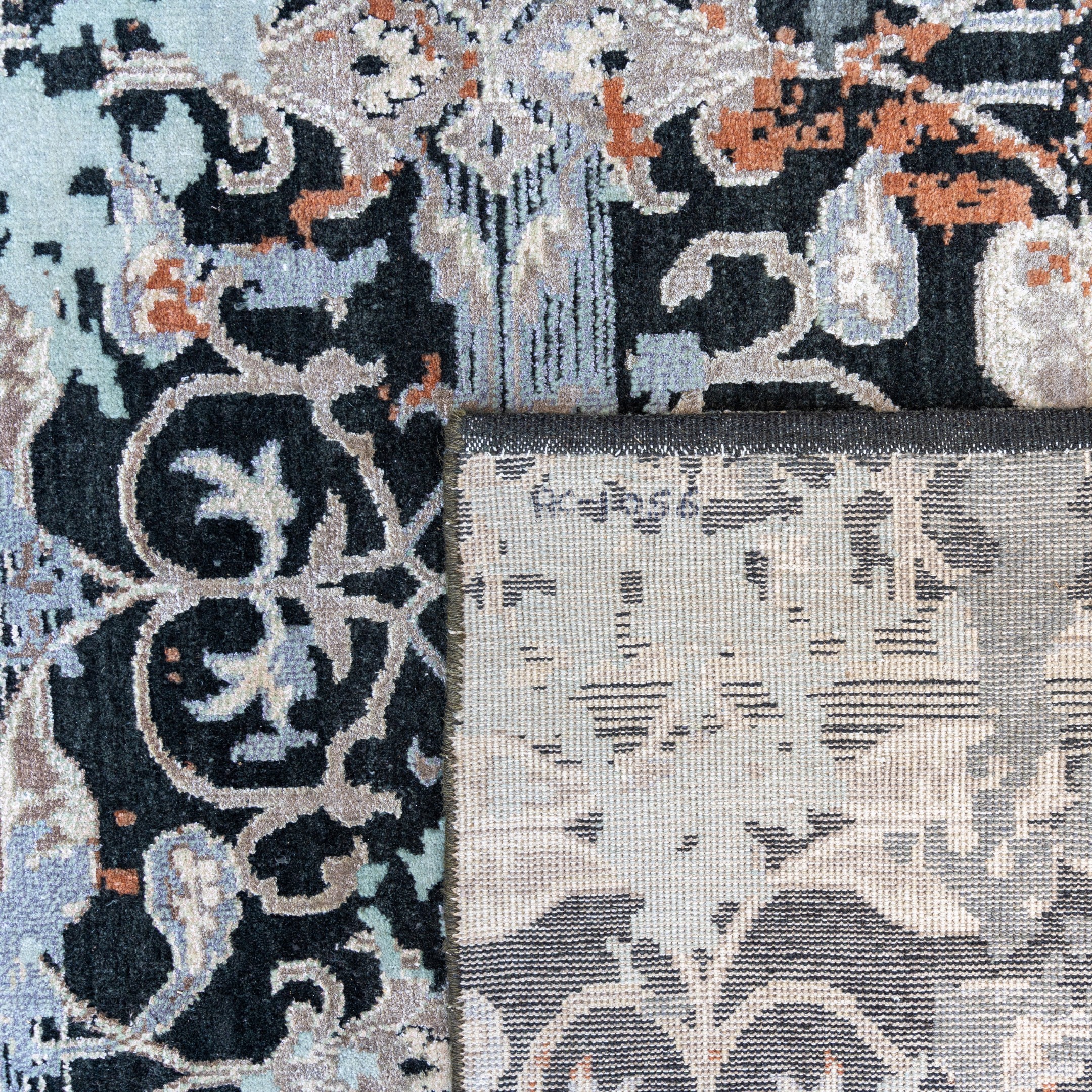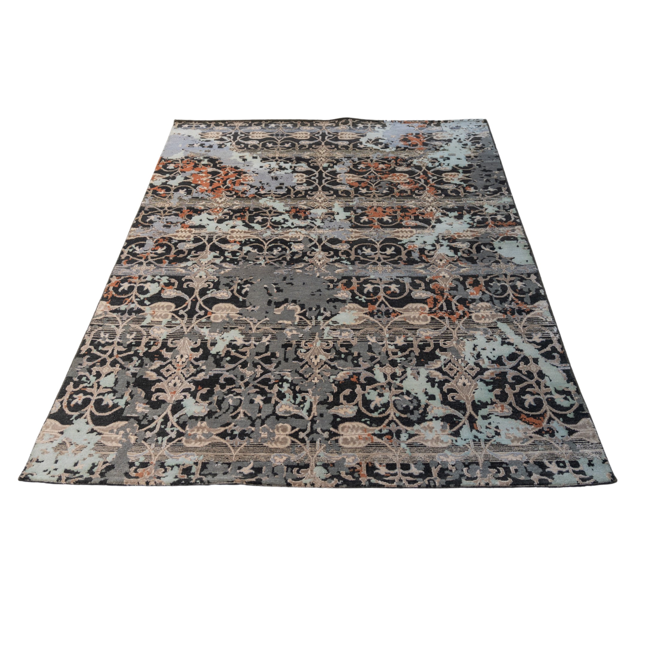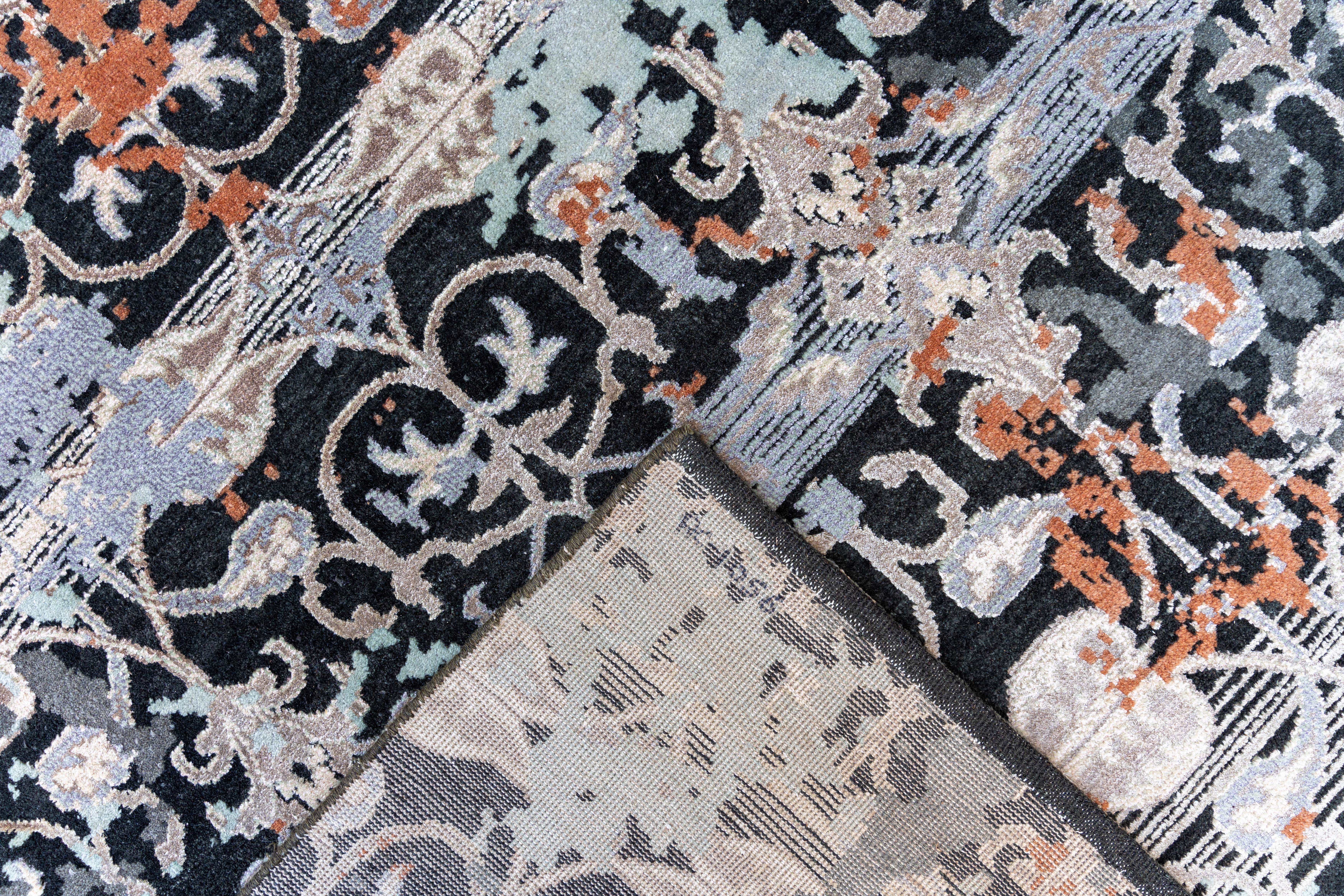 This striking hand-knotted carpet represents the perfect convergence of classical geometry and modern abstract expressionism. The foundation of the design is a structured,traditional floral trellis—reminiscent of Mughal garden ironwork—rendered in high-contrast ivory against a deep midnight-charcoal field. This orderly pattern is dramatically interrupted by an artistic "erasure" effect, where washes of icy blue and oxidized copper-rust obscure the lattice like drifting mist or weathered paint. The result is a transitional masterpiece that offers the grounding symmetry of a heritage rug with the bold, avant-garde energy of contemporary art, making it a sophisticated focal point for high-end interiors.