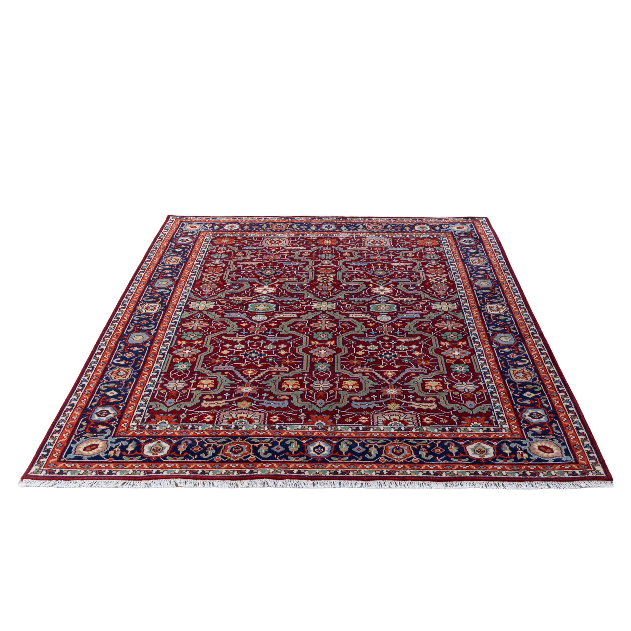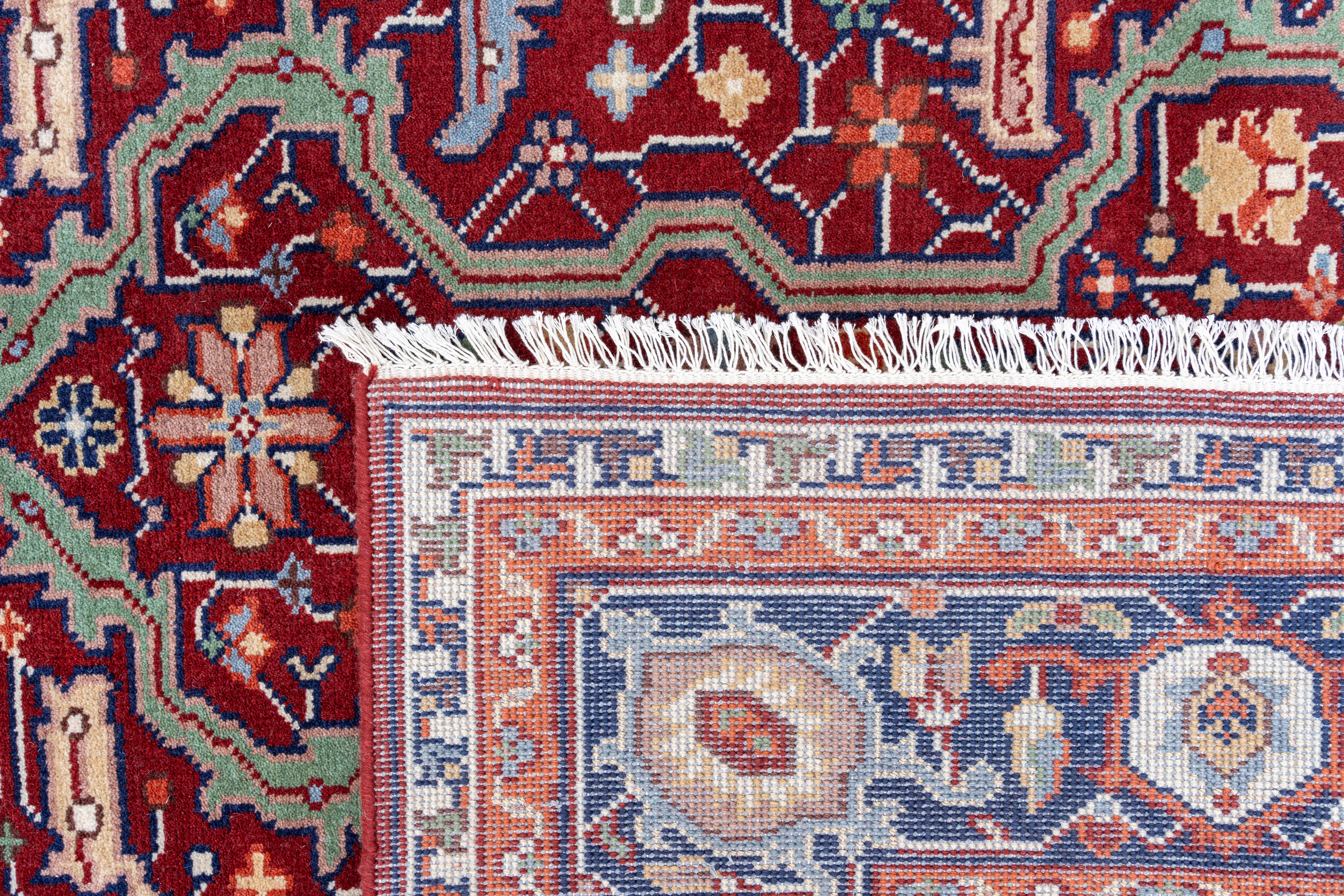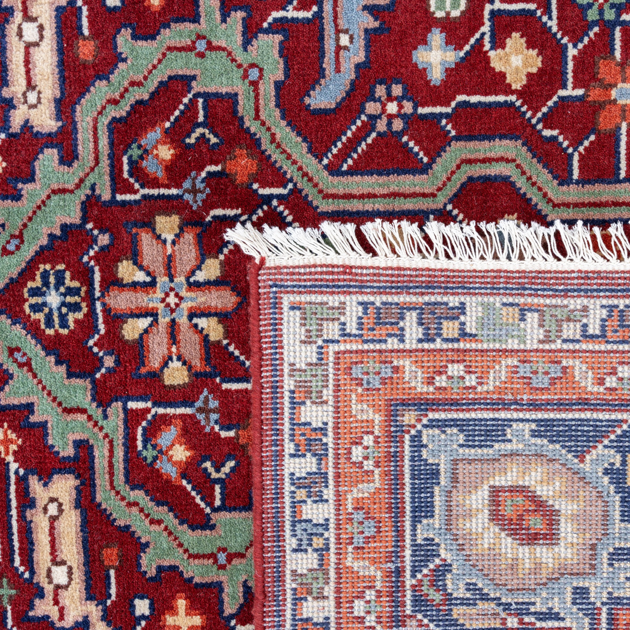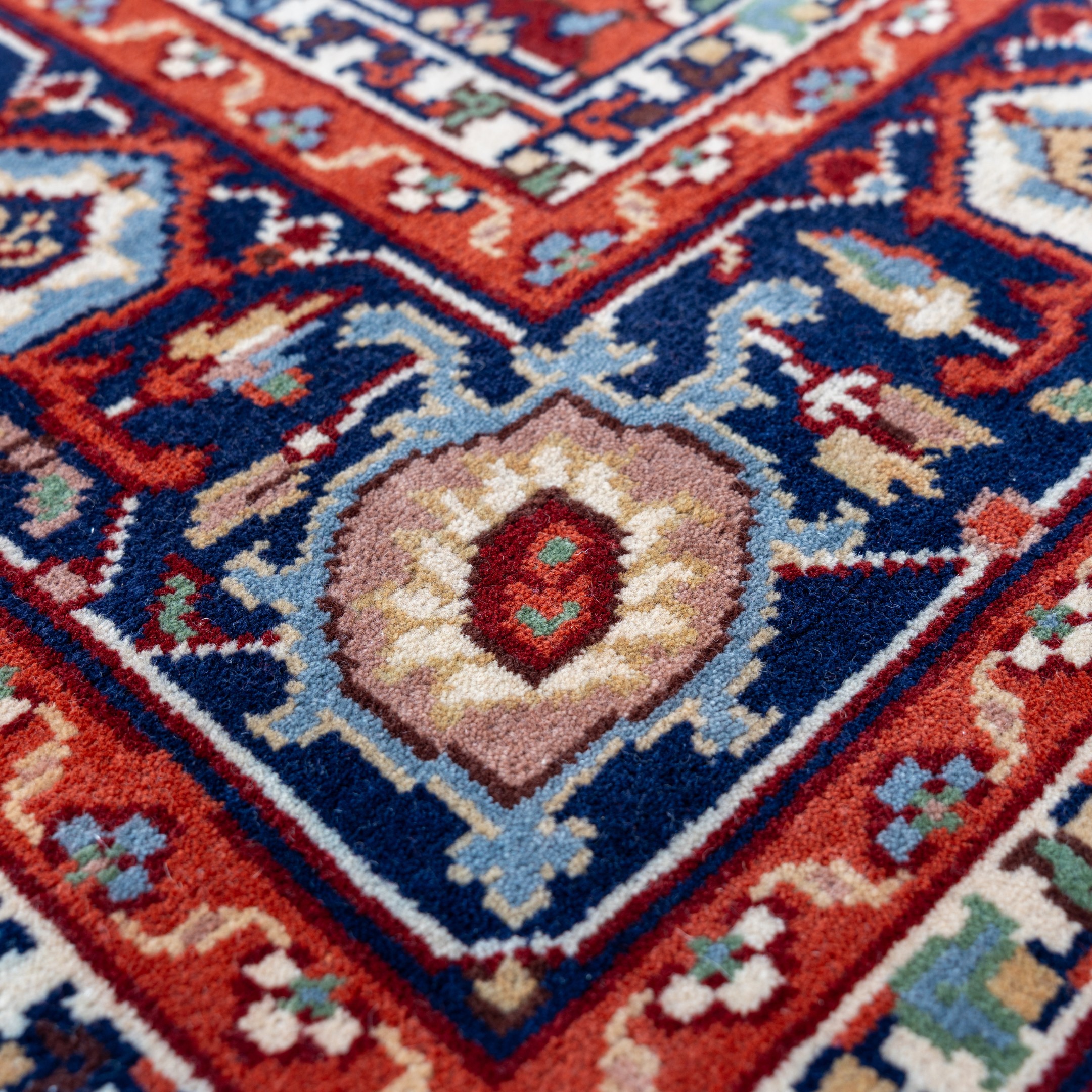 This masterpiece features a traditional Persian-style geometric medallion, intricately hand-knotted in a palette of deep ruby red and indigo blue. A product of immense human endurance, the rug showcases the grit of the artisan through its fine knot density and symmetrical floral motifs. Crafted from premium natural wool, it is an heirloom-quality piece that brings the soulful tradition of Indian craftsmanship into any global living space.